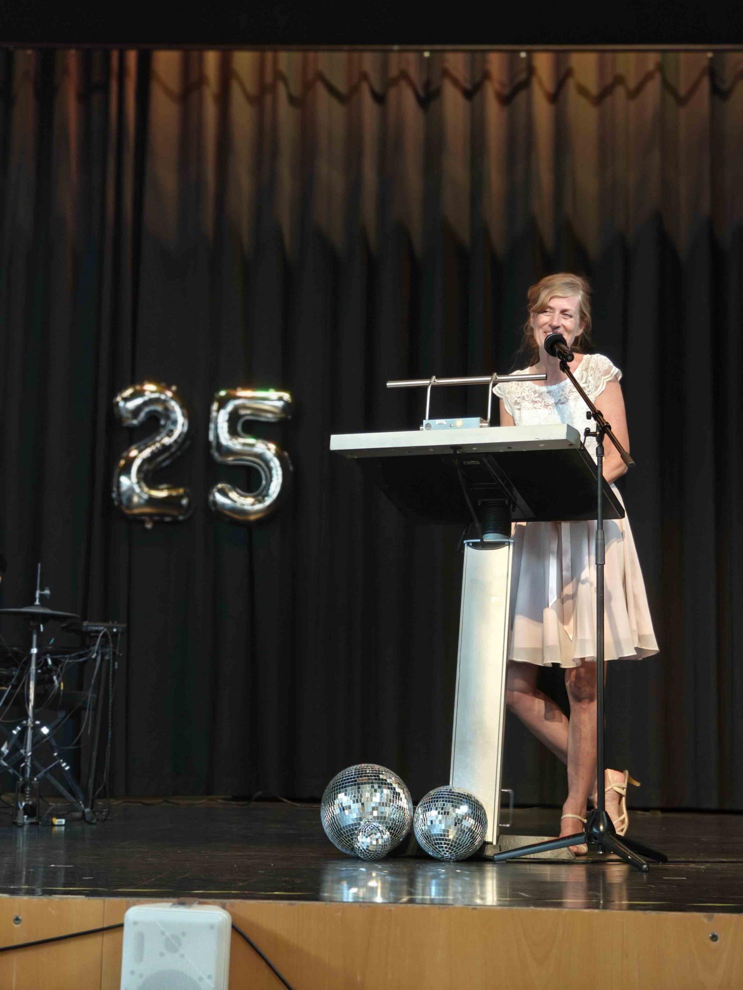 Schulleiterin Gabriele Reeb erklärte in ihrer Rede, dass dieser Abiturjahrgang für sie ein ganz besonderer sei – insbesondere, da es sich um ihren letzten handele, da sie Ende Juli in den Ruhestand gehe. Sie sei sehr stolz auf den Jahrgang, von dem ein Drittel einen Abschluss mit „Eins komma“ gemacht habe. Dazu passe auch das Lied von ABBA, auf das sich das diesjährige Abimotto beziehe: The Winner takes it all. Denn alle Schüler:innen dieses Jahrgangs seien Sieger:innen.
