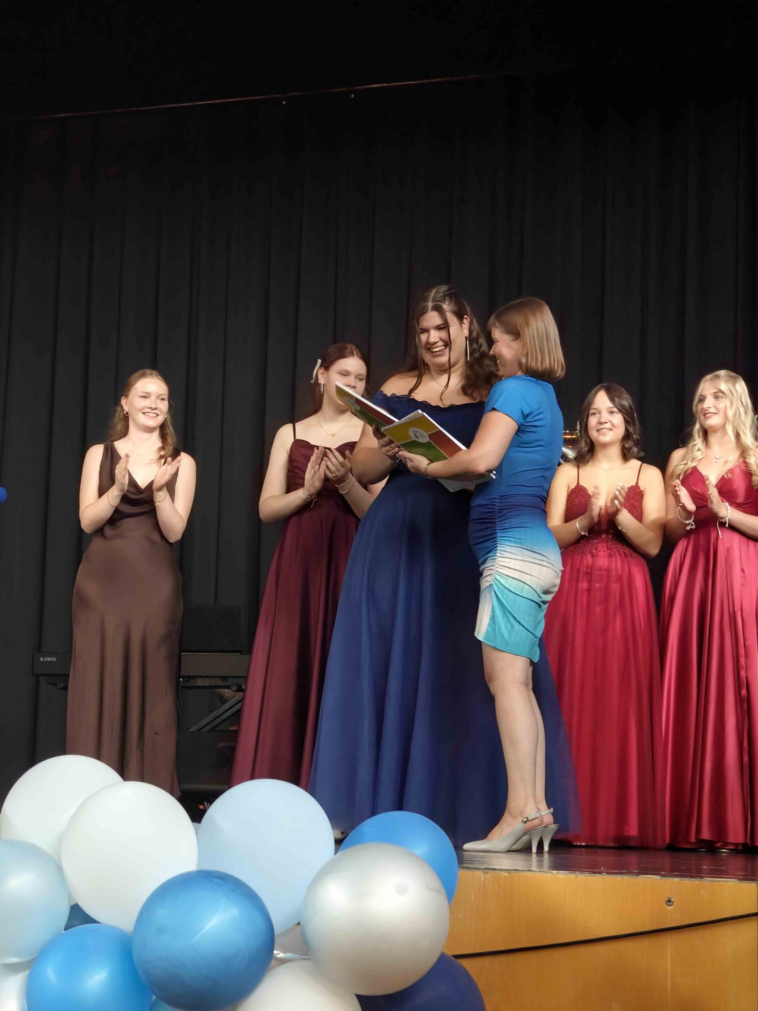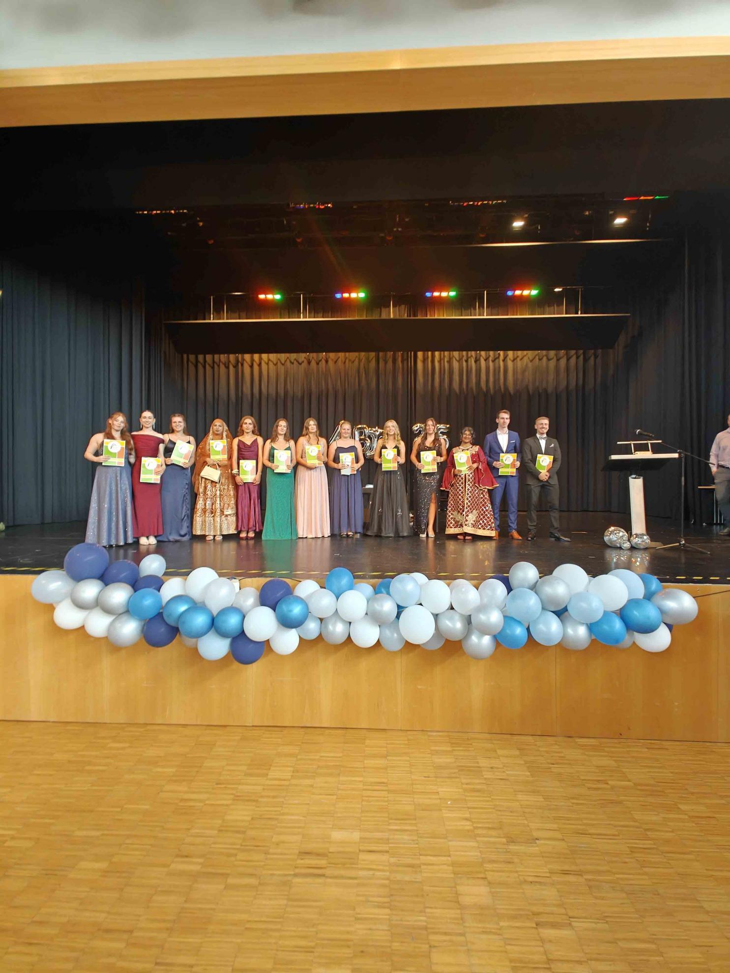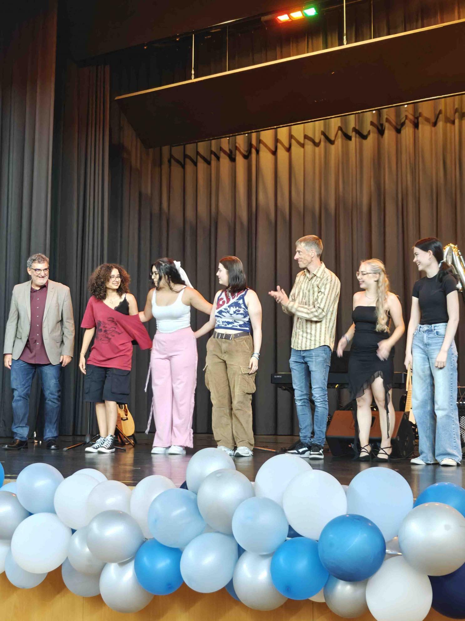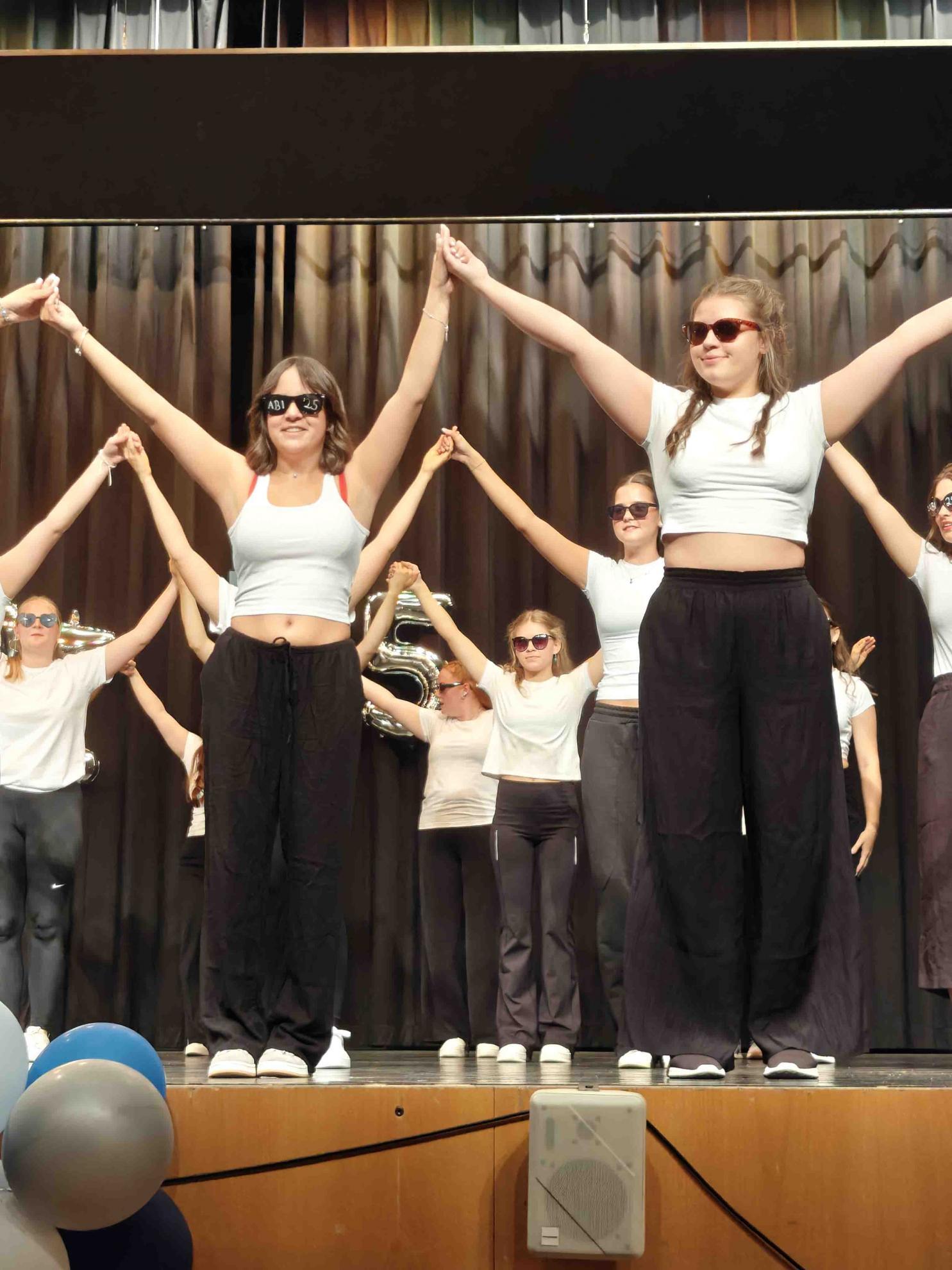 Für einen krönenden Abschluss sorgten zwei Tänze, welche die Absolvent:innen einstudiert hatten. Der fünfstündige Mathekurs unter der Leitung von Frau Filian überraschte mit einer originellen Choreografie: Die Schüler:innen stellten mit ihren Armen verschiedene Funktionsgraphen dar – von der linearen Funktion bis zur Sinuskurve –, was bei Publikum und (Mathe-)Lehrkräften gleichermaßen für Begeisterung sorgte.