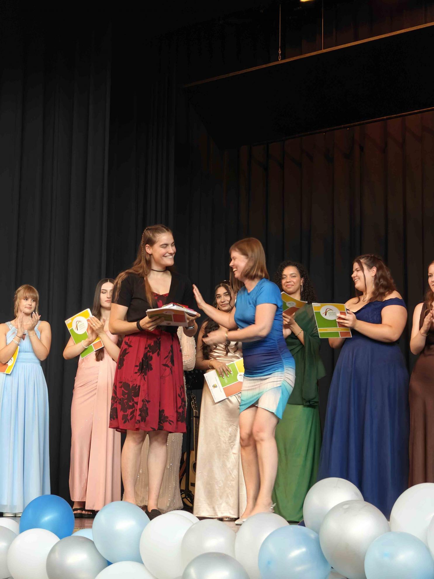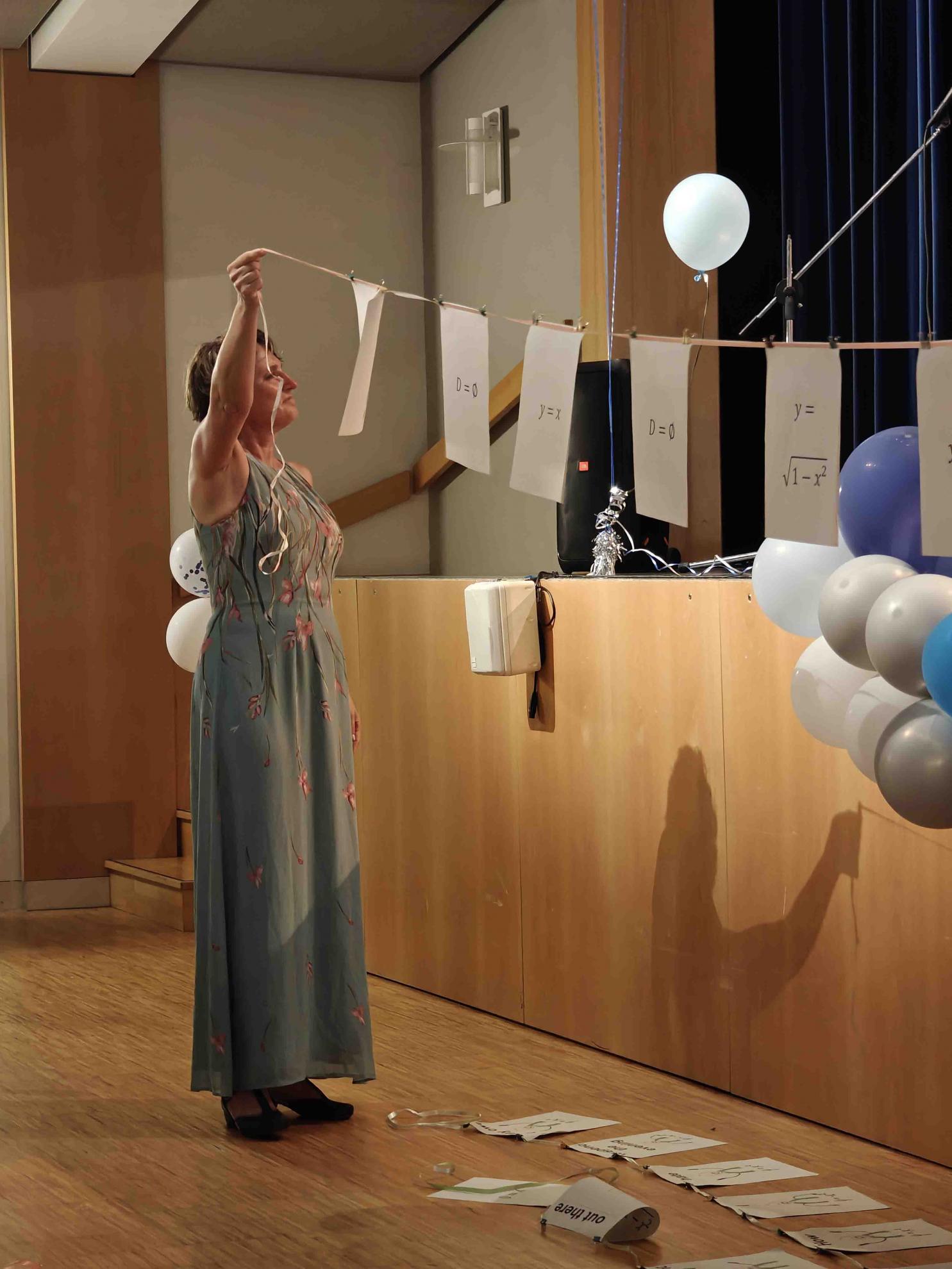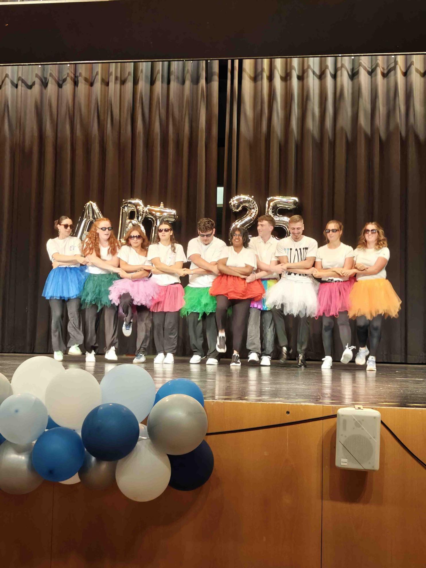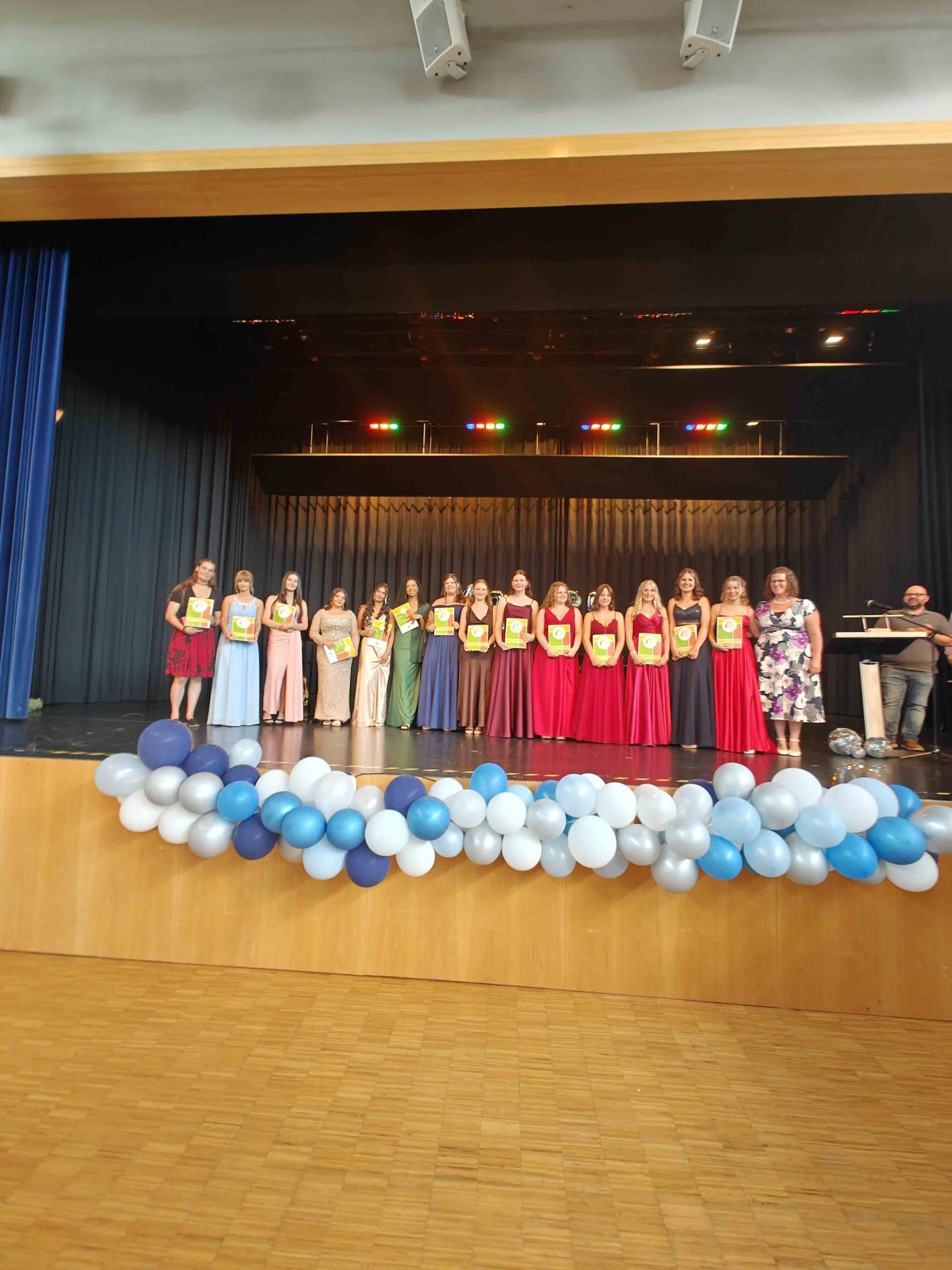 Für einen krönenden Abschluss sorgten zwei Tänze, welche die Absolvent:innen einstudiert hatten. Der fünfstündige Mathekurs unter der Leitung von Frau Filian überraschte mit einer originellen Choreografie: Die Schüler:innen stellten mit ihren Armen verschiedene Funktionsgraphen dar – von der linearen Funktion bis zur Sinuskurve –, was bei Publikum und (Mathe-)Lehrkräften gleichermaßen für Begeisterung sorgte.
