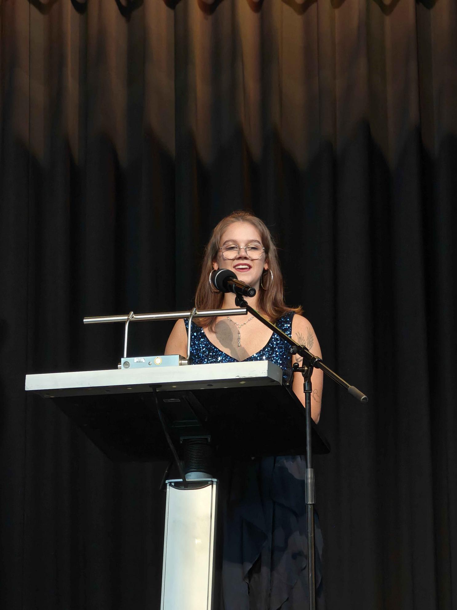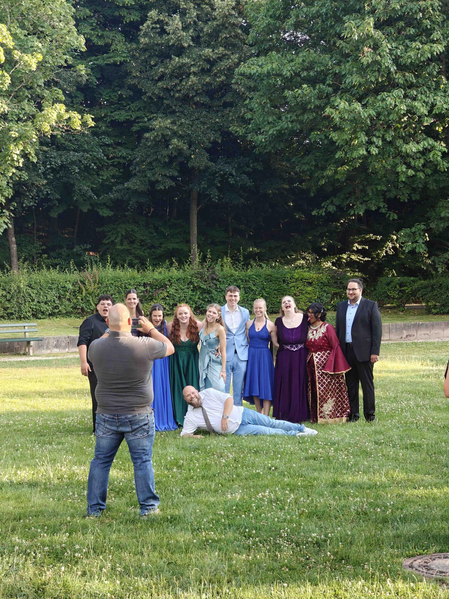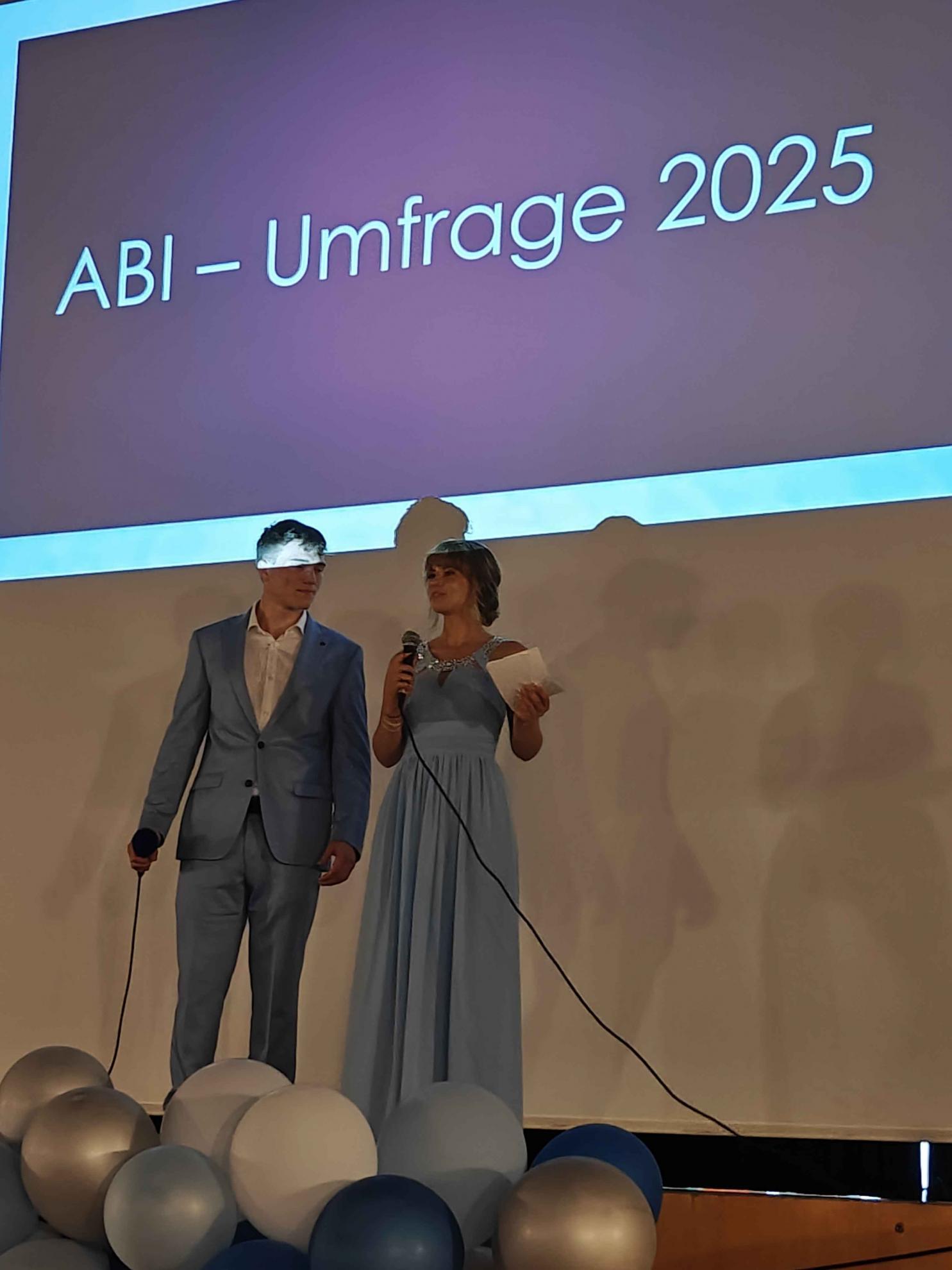 Während einer zweistündigen Pause konnte sich die Feiergemeinschaft bei Speis und Trank stärken und Erinnerungsfotos vor der Fotowand machen, bevor dann der unterhaltsame inoffizielle Teil des Abends begann. Die beiden Absolvent:innen Ellie Kühn und Alessio De Simone führten gekonnt durchs Programm, das von den Abiturient:innen selbst gestaltet wurde.