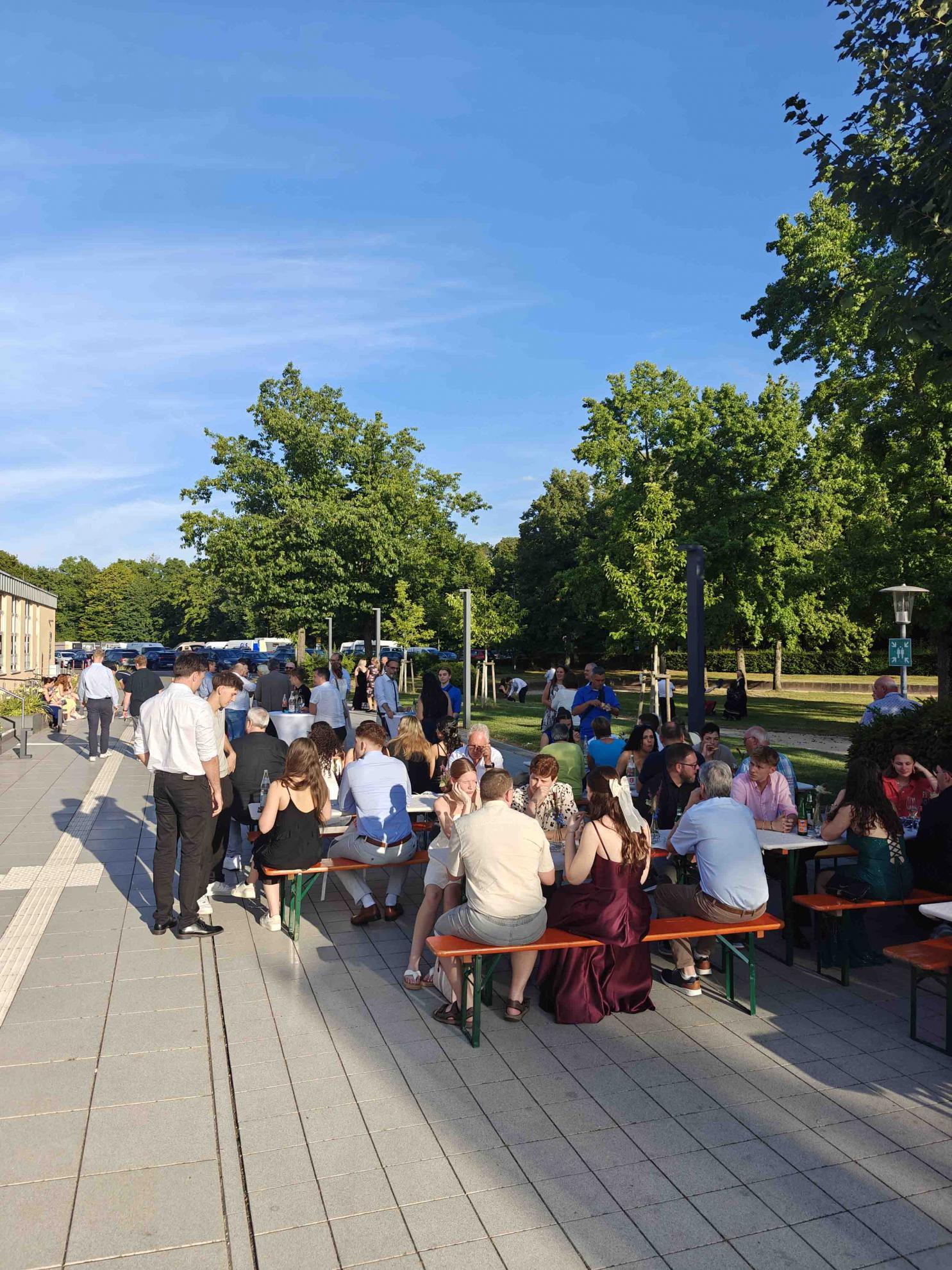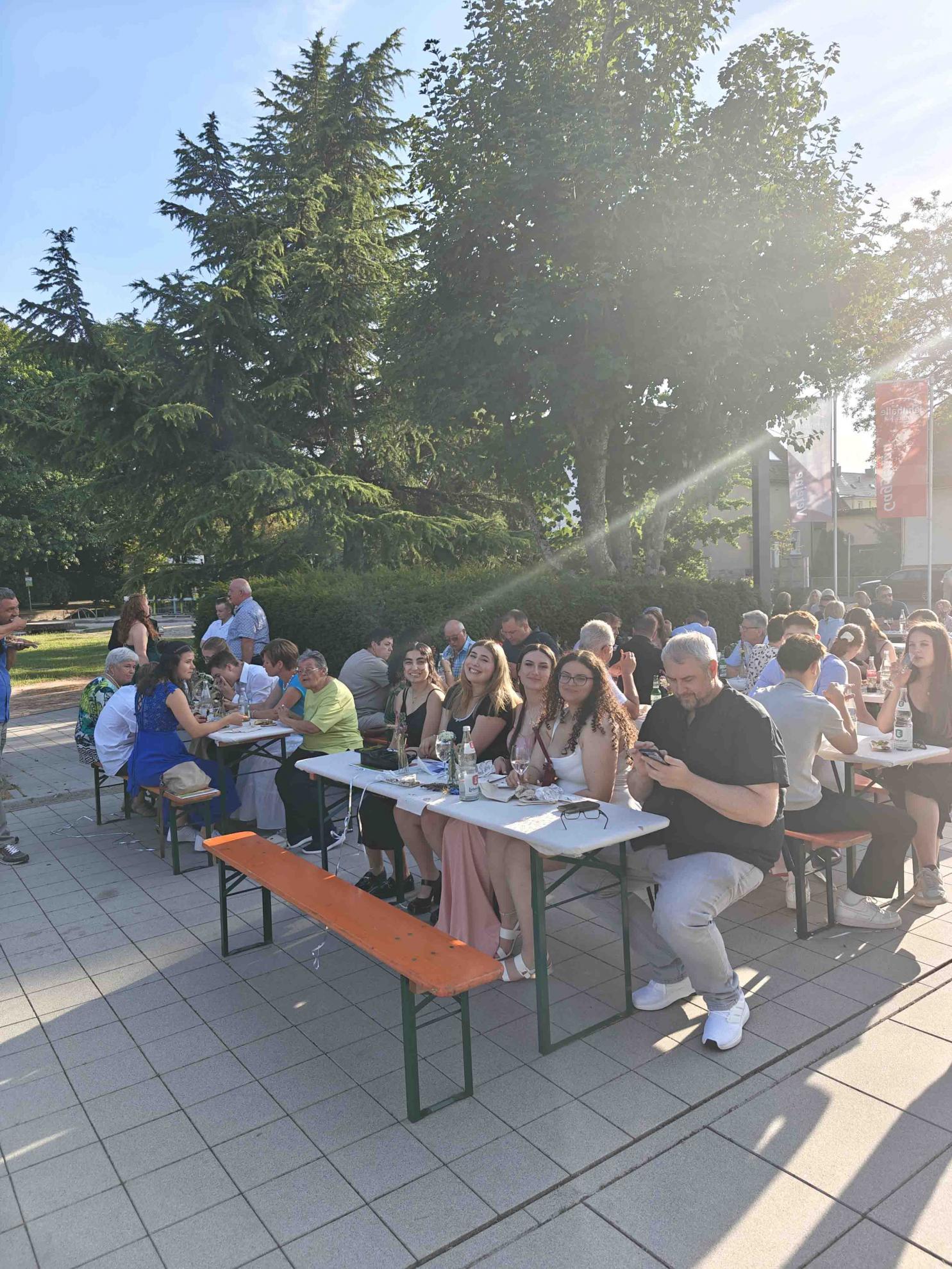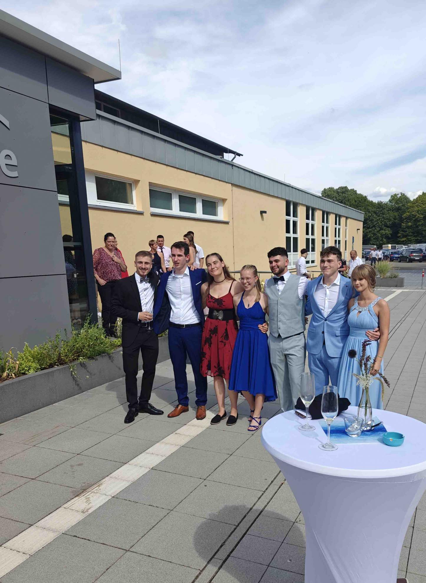 Während einer zweistündigen Pause konnte sich die Feiergemeinschaft bei Speis und Trank stärken und Erinnerungsfotos vor der Fotowand machen, bevor dann der unterhaltsame inoffizielle Teil des Abends begann. Die beiden Absolvent:innen Ellie Kühn und Alessio De Simone führten gekonnt durchs Programm, das von den Abiturient:innen selbst gestaltet wurde.