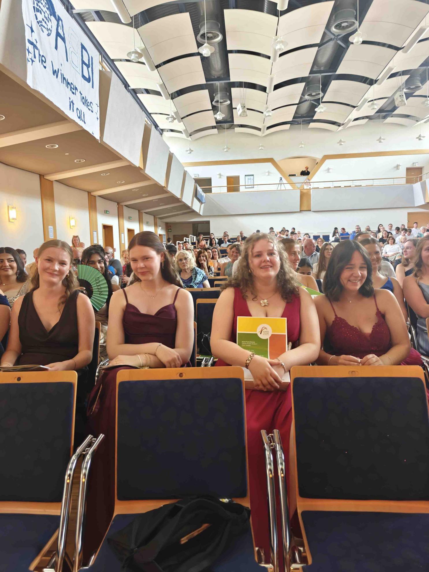 Ein sehr emotionaler Moment war die Einspielung einer Videosequenz, in der sich die Schüler:innen bei einer ehemaligen Mitschülerin bedankten, die großen Einsatz bei der Organisation der Abifeier gezeigt hatte. Die Botschaften waren herzlich und aufrichtig – ein bewegender Beweis für den starken Zusammenhalt im Jahrgang.