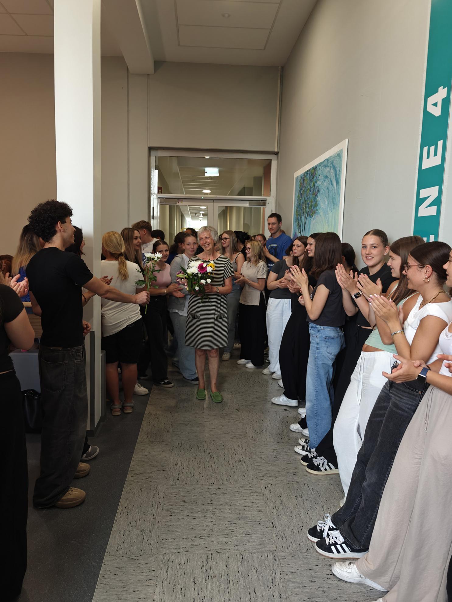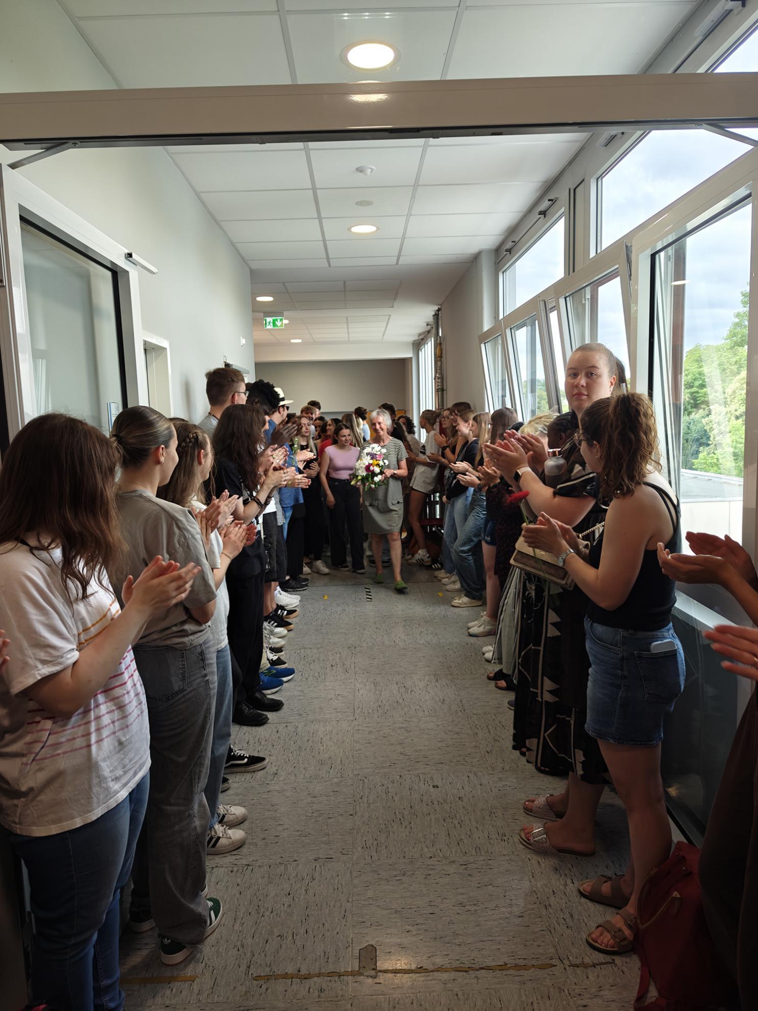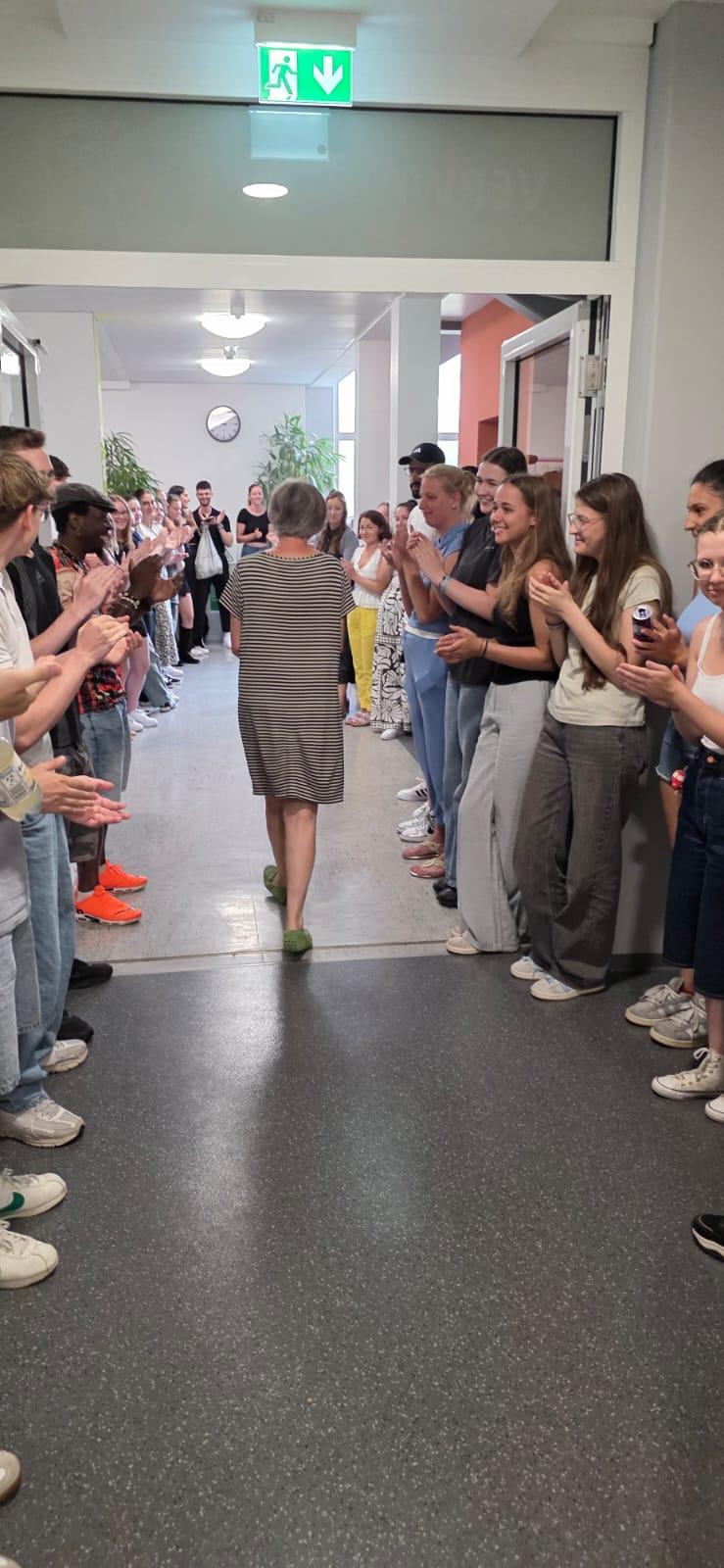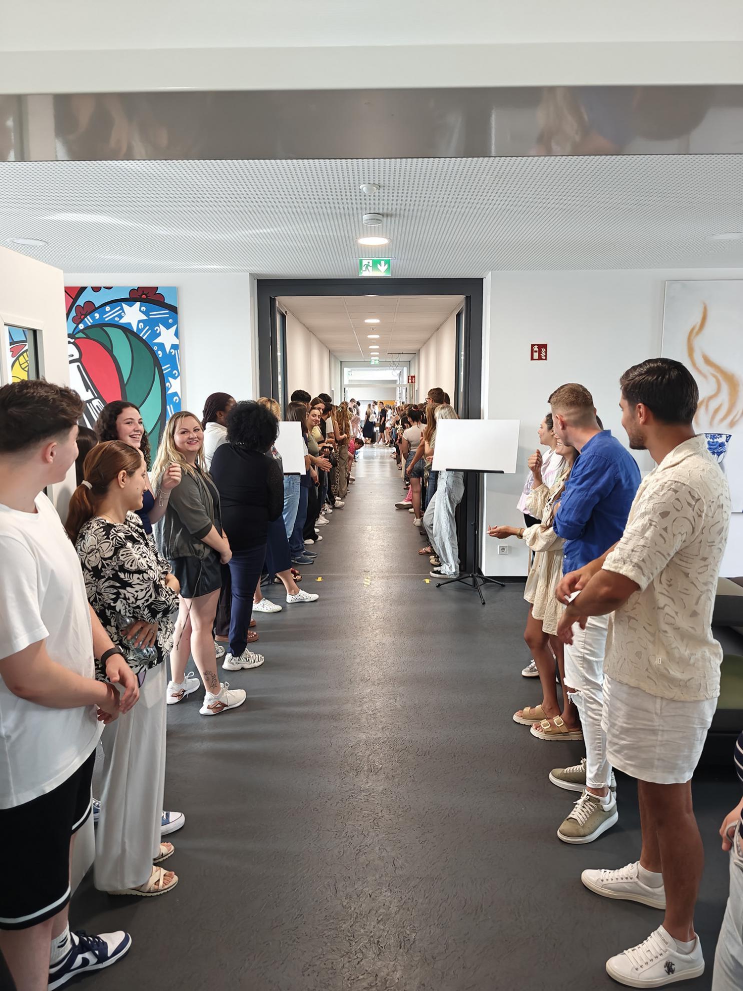 Anlässlich ihrer anstehenden Pension versammelten sich unsere Schüler:innen am vergangenen Freitag, um für Frau Reeb Spalier zu stehen und sich von ihr zu verabschieden. Unser Schülersprecher:innenteam richtete ein paar warme Worte an die Schulleitung und betonte die Vielfalt, die an unserer Schule herrscht. Ausdruck dafür ist das bunte Kunstwerk, das die Schüler:innenschaft gemeinsam erstellt hat und Frau Reeb zum offiziellen Abschied Ende Juli überreicht wird.