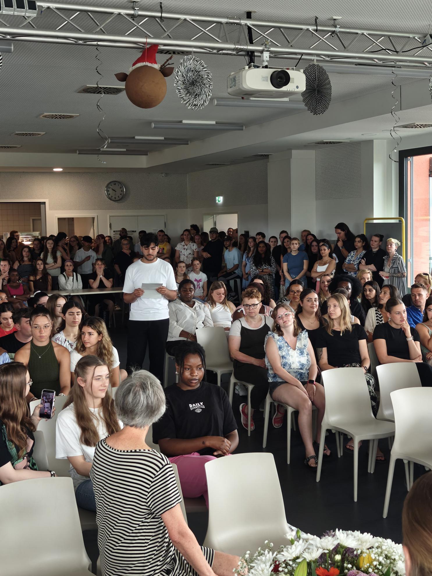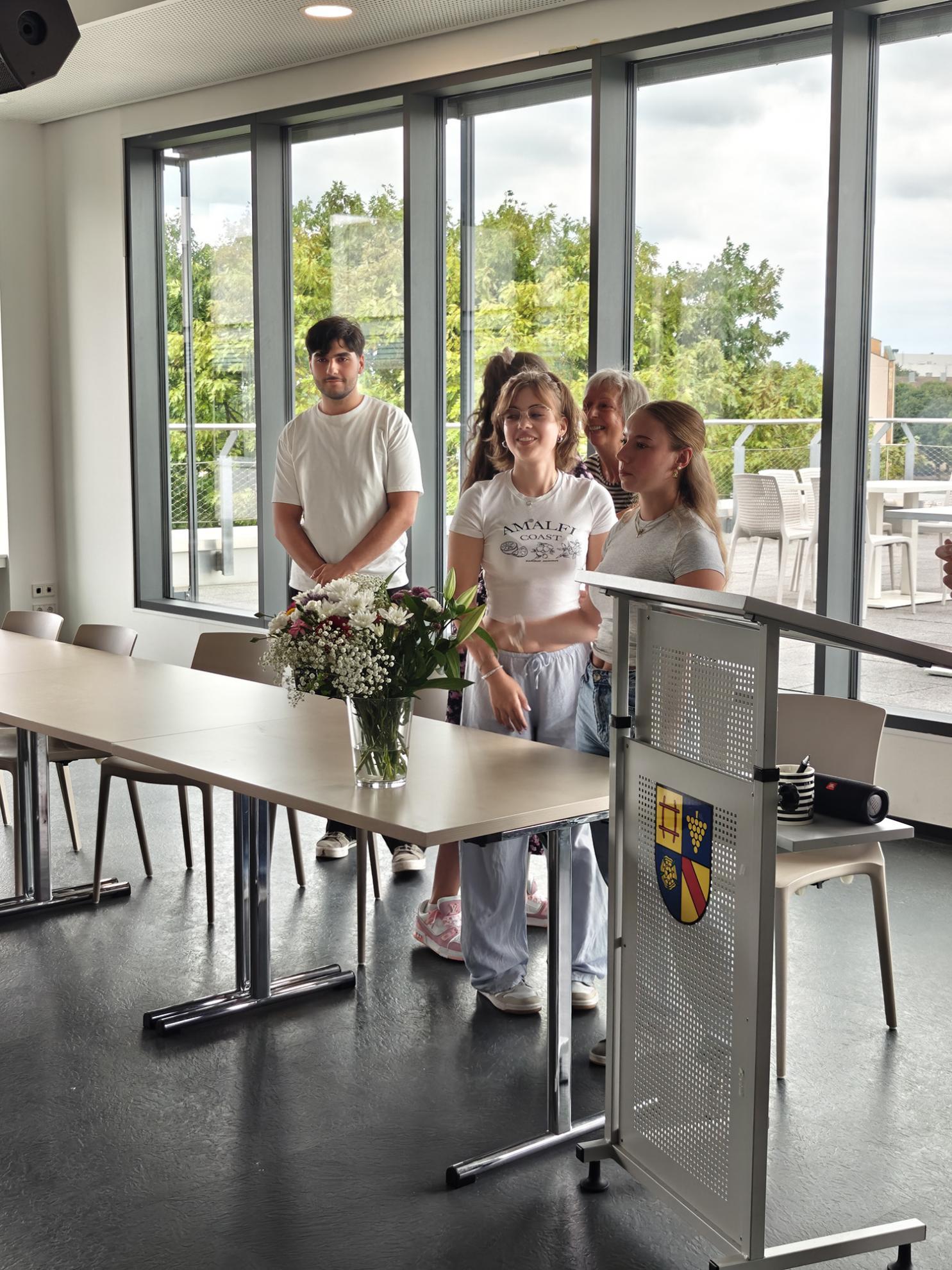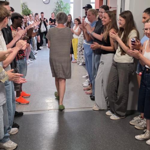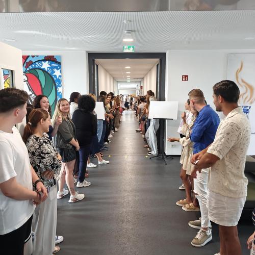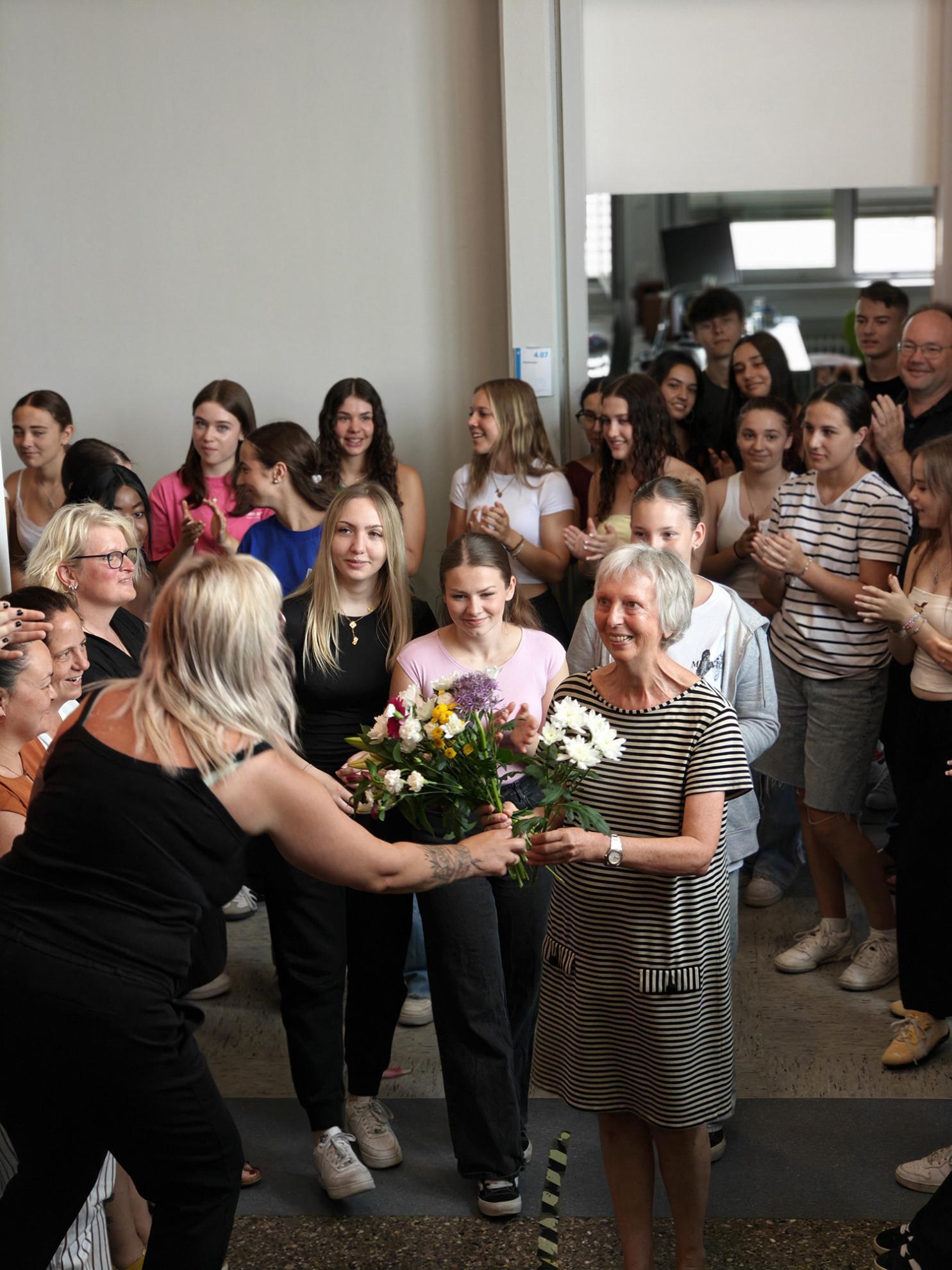 Anlässlich ihrer anstehenden Pension versammelten sich unsere Schüler:innen am vergangenen Freitag, um für Frau Reeb Spalier zu stehen und sich von ihr zu verabschieden. Unser Schülersprecher:innenteam richtete ein paar warme Worte an die Schulleitung und betonte die Vielfalt, die an unserer Schule herrscht. Ausdruck dafür ist das bunte Kunstwerk, das die Schüler:innenschaft gemeinsam erstellt hat und Frau Reeb zum offiziellen Abschied Ende Juli überreicht wird.
