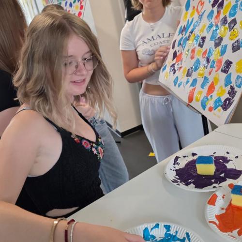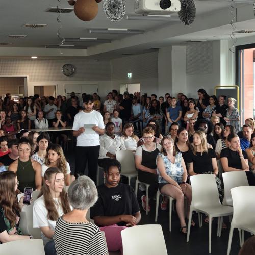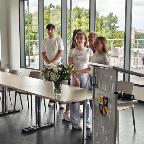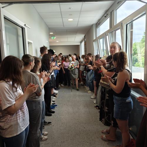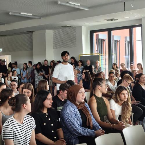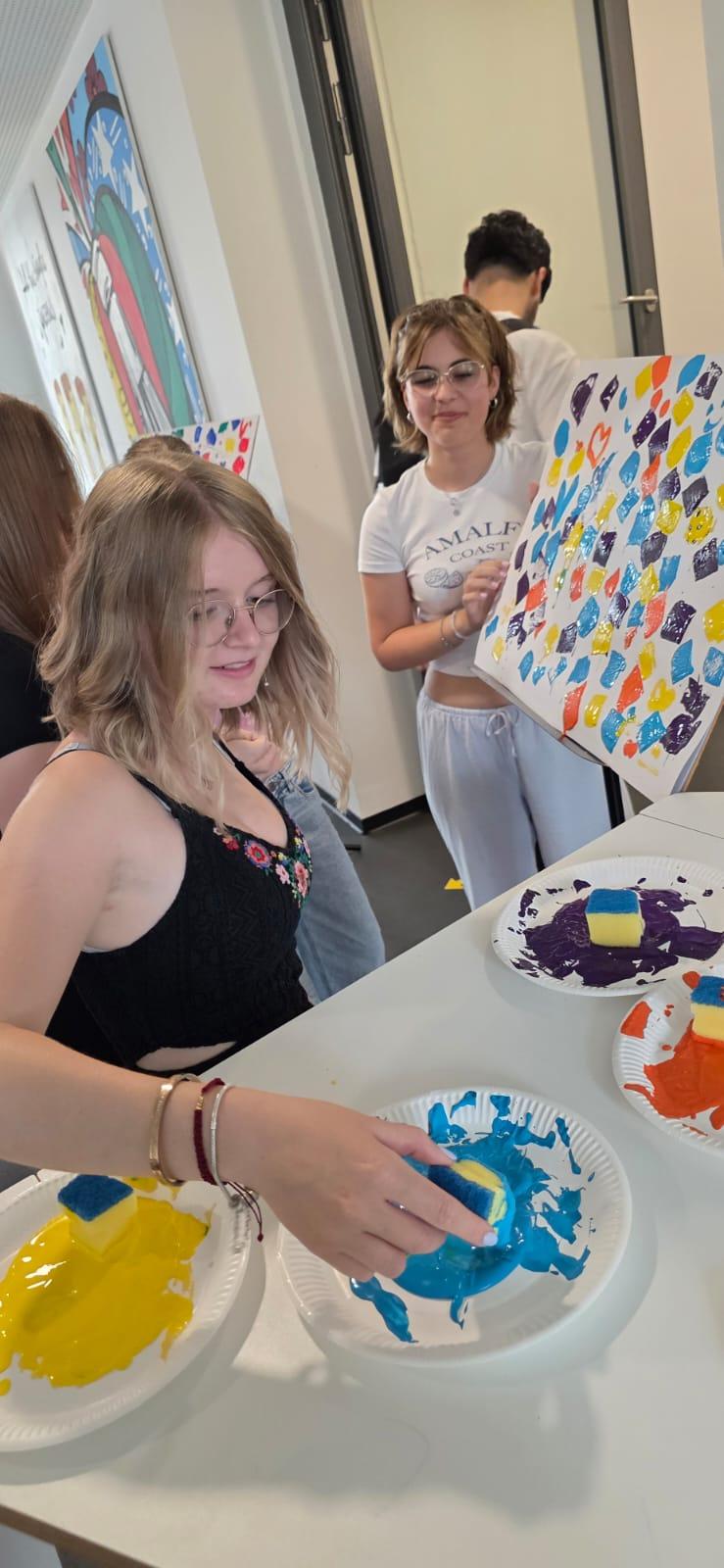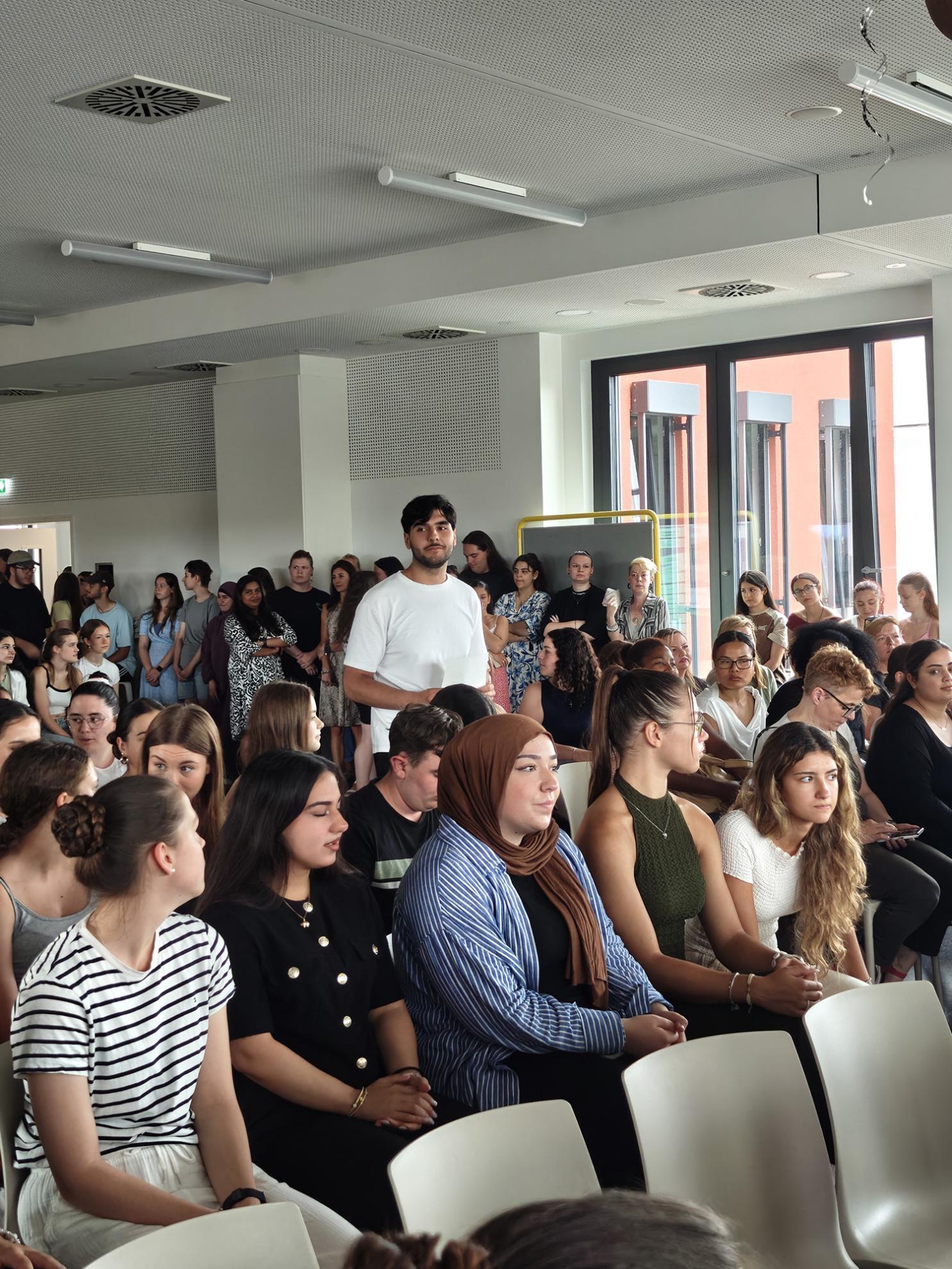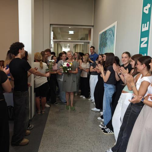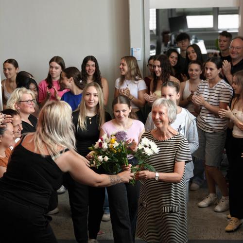 Anlässlich ihrer anstehenden Pension versammelten sich unsere Schüler:innen am vergangenen Freitag, um für Frau Reeb Spalier zu stehen und sich von ihr zu verabschieden. Unser Schülersprecher:innenteam richtete ein paar warme Worte an die Schulleitung und betonte die Vielfalt, die an unserer Schule herrscht. Ausdruck dafür ist das bunte Kunstwerk, das die Schüler:innenschaft gemeinsam erstellt hat und Frau Reeb zum offiziellen Abschied Ende Juli überreicht wird.