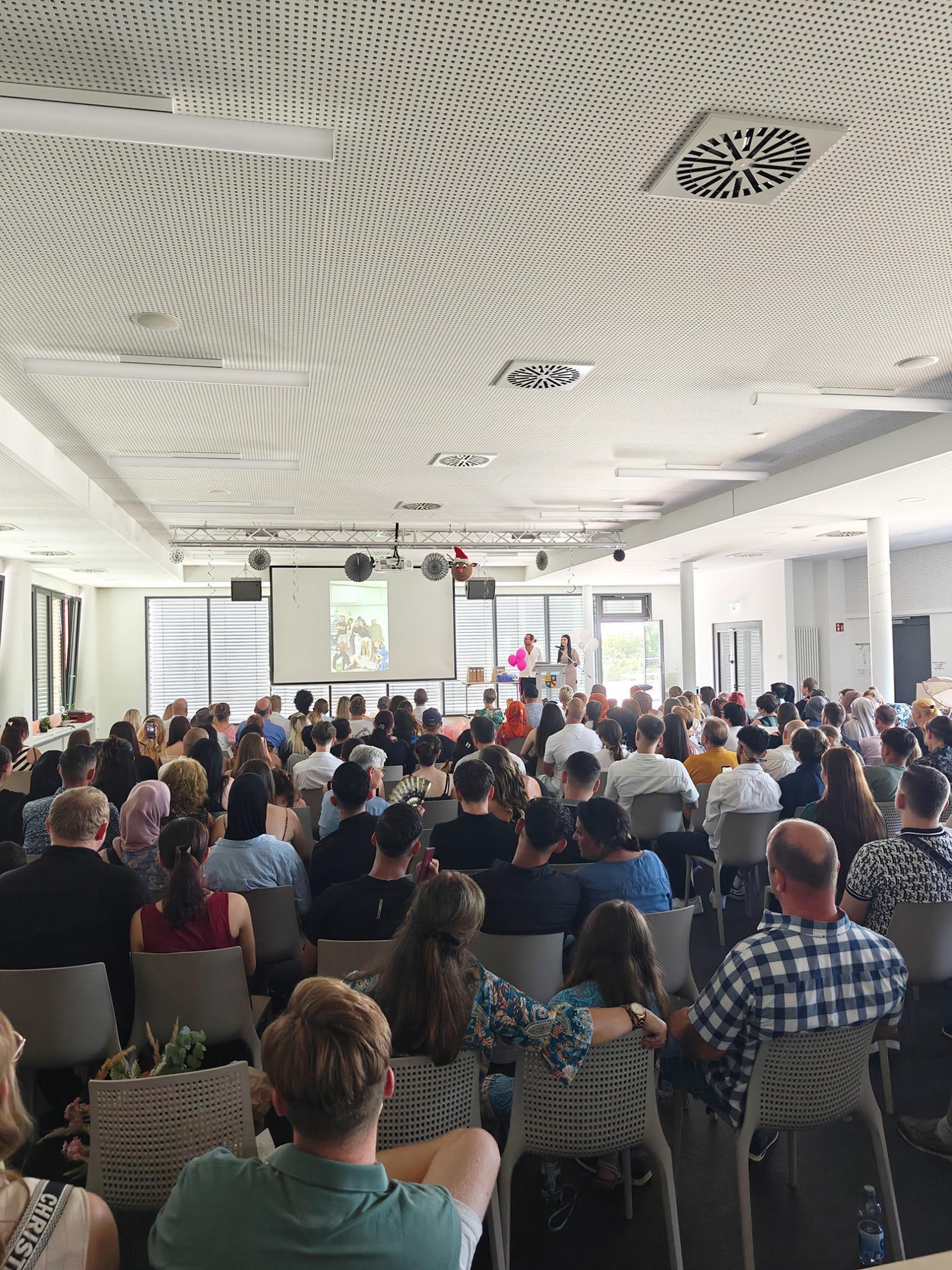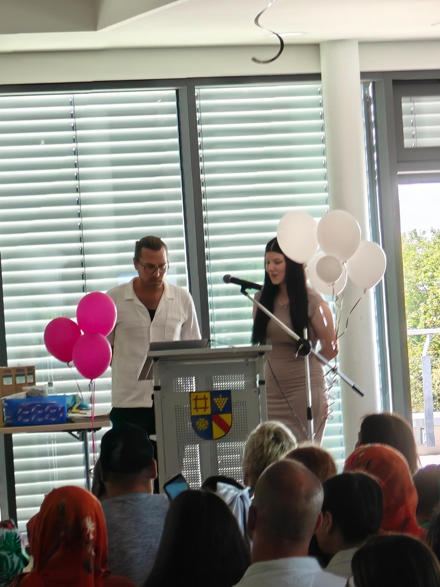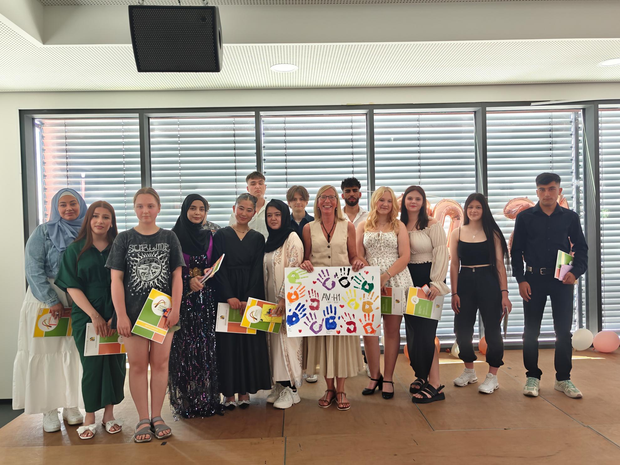 Frank Burkhardt, der Klassenlehrer der VABO, berichtete stolz, dass neun seiner Schützlinge die Deutschprüfung für das A2-Niveau geschafft haben und vier davon sogar die Prüfung für das B1-Niveau. Außerdem erhielten fünf der Schüler:innen einen Preis (Léda Földi, Nedima Hadzic, Mustafa Özcan) oder ein Lob (Ismael Akrami, Anya Pliush) für ihre Leistungen im Gesamtjahr. Der Großteil der Schüler:innen der Klasse, welche sich dieses Jahr aus insgesamt zehn unterschiedlichen Nationen – nämlich Bosnien, Ungarn, Serbien, Ukraine, Russland, Afghanistan, Irak, Syrien, Türkei und Philippinen – zusammensetzt, wird an der Anne-Frank-Schule bleiben. In der Schulart AV werden sie dann nämlich auf ihren Hauptschulabschluss vorbereitet. Einige belegen in den Sommerferien noch einen Deutschkurs, um ihre Deutschkenntnisse weiter aufzubessern und ihre Ausbildungschancen zu erhöhen. Zum Abschied gab es für alle Schüler:innen neben dem Zeugnis noch einen Brief mit persönlichen Grüßen und einen Kugelschreiber zum Andenken. Außerdem richtete Nedima Hadzic, die Klassensprecherin der VABO, ein paar persönliche Worte an das Plenum und erinnerte mit einer Fotoshow an die Highlights des Schuljahres.