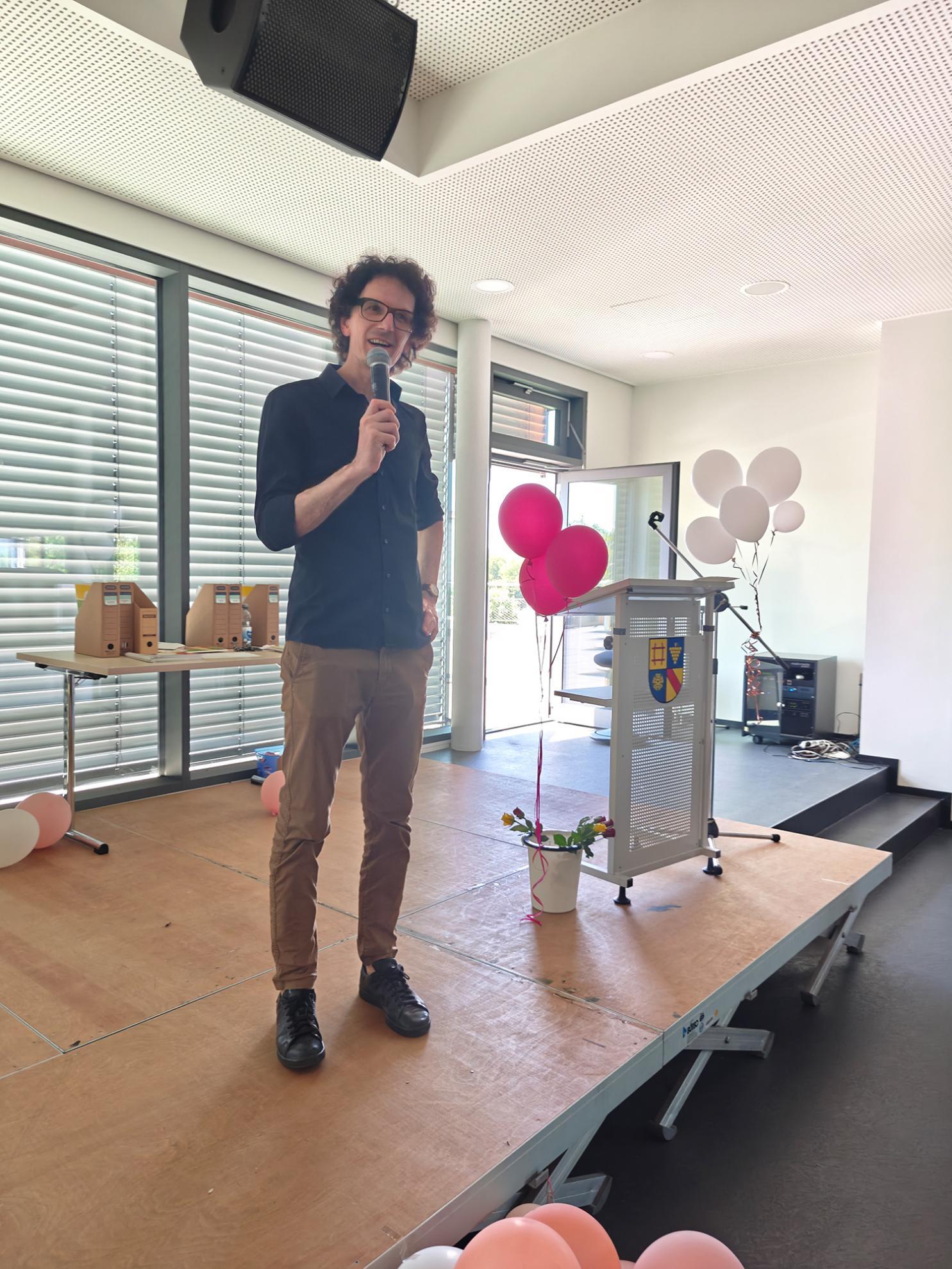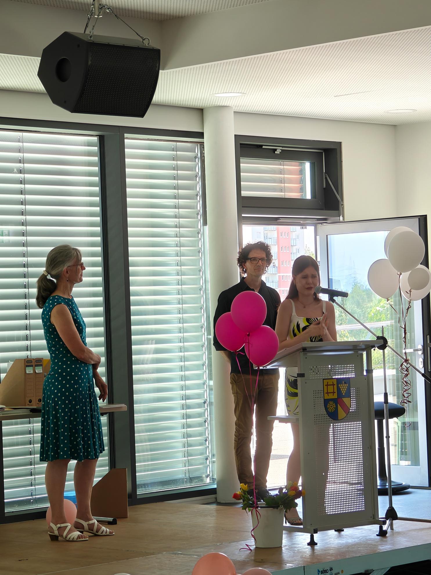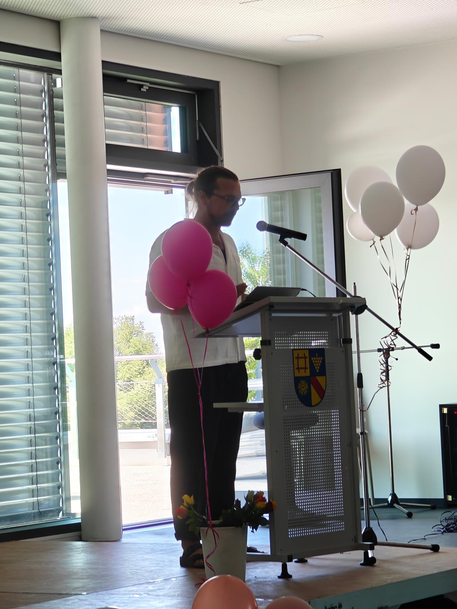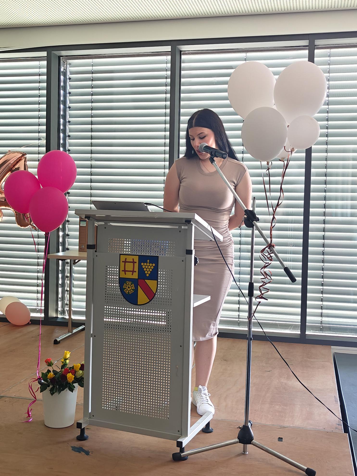 Die Zeugnisse der Schüler:innen der H2 konnten leider nicht von Daniela Engling, der Klassenlehrkraft, übergeben werden, sodass Brigitte Matt sowie Sebastian Heide, der Abteilungsleiter der Schulart AV, den Absolvent:innen gratulierten und die Zeugnisse überreichten. Frau Matt verglich die Klasse mit dem Film „Das fliegende Klassenzimmer“, da die Schüler:innen stets für einen Streich zu haben waren, und gab den Absolvent:innen mit auf den Weg, weiterhin so neugierig zu bleiben.