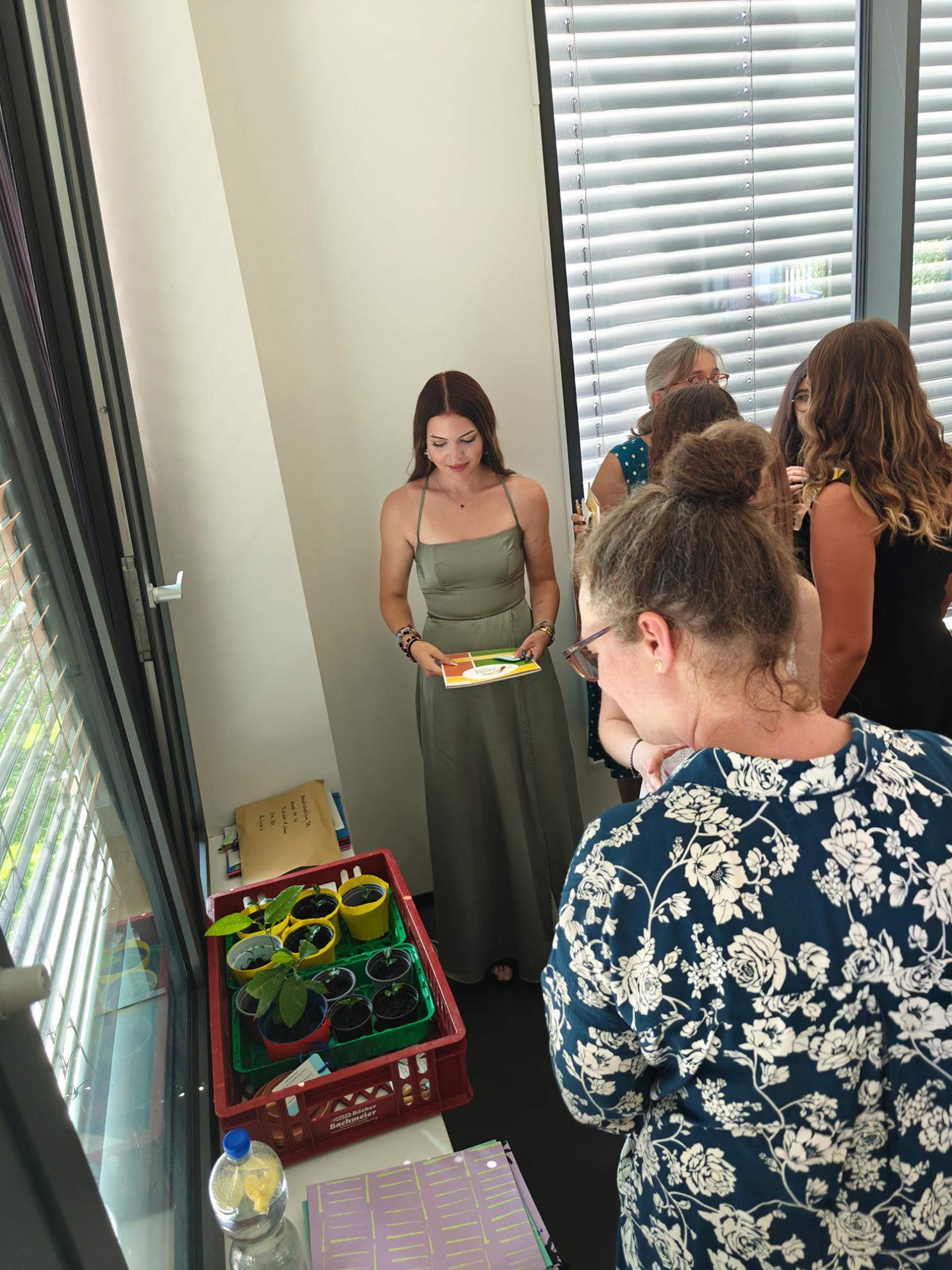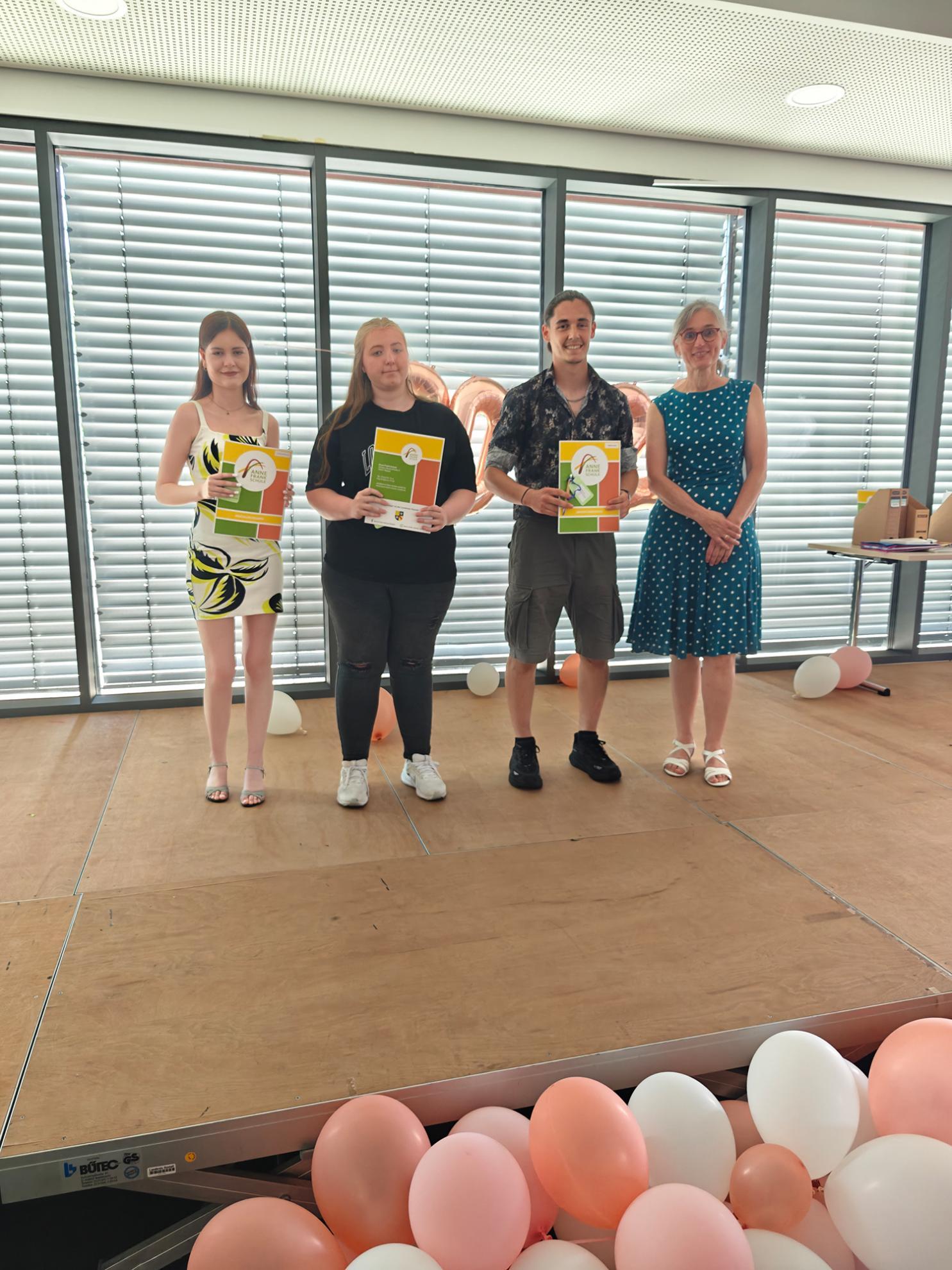 Die Klasse P1 des Profils „Gesundheit und Pflege“ bekam von Michèle Adelhardt nicht nur Zeugnisse, sondern auch ein kleines Zitronenpflänzchen überreicht. Die Schüler:innen hatten zu Beginn des Schuljahres einen Zitronenkern erhalten, welchen sie eingepflanzt und das Schuljahr über beim Wachsen beobachten konnten. Da sie – glücklicherweise – nicht lange genug an der Schule waren, um die Früchte ihrer Arbeit zu ernten, gab es von Frau Adelhardt zusätzlich noch ein Fläschchen Limonade und weise Worte dazu. In der P1 erhielt Isabella Tribut für ihre besonders guten Leistungen einen Preis und auch Phoebe Greschner konnte für ihre guten Noten ein Lob entgegennehmen.