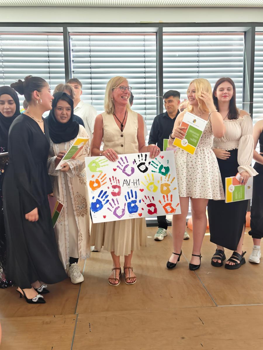 Anja Winnes, die Klassenlehrerin der H1, war besonders stolz auf die Schüler:innen ihrer Klasse: Insgesamt 13 Schüler:innen aus vielen Nationen hätten ihren Hauptschulabschluss geschafft. Fünf von ihnen blieben an unserer Schule, alle anderen hätten einen Ausbildungs- bzw. einen anderen Schulplatz gefunden. Besonders hervorzuheben seien Roya Azizi, Ahmed Glotić und Maksym Gvozdyukov, die für ihre guten Leistungen ein Lob erhielten. Die Klasse hatte sich etwas Besonderes einfallen lassen und ausnahmsweise mal ihren Lehrkräften Zeugnisse ausgestellt, in denen unter anderem Pünktlichkeit und Frisurenvielfalt bewertet wurde.