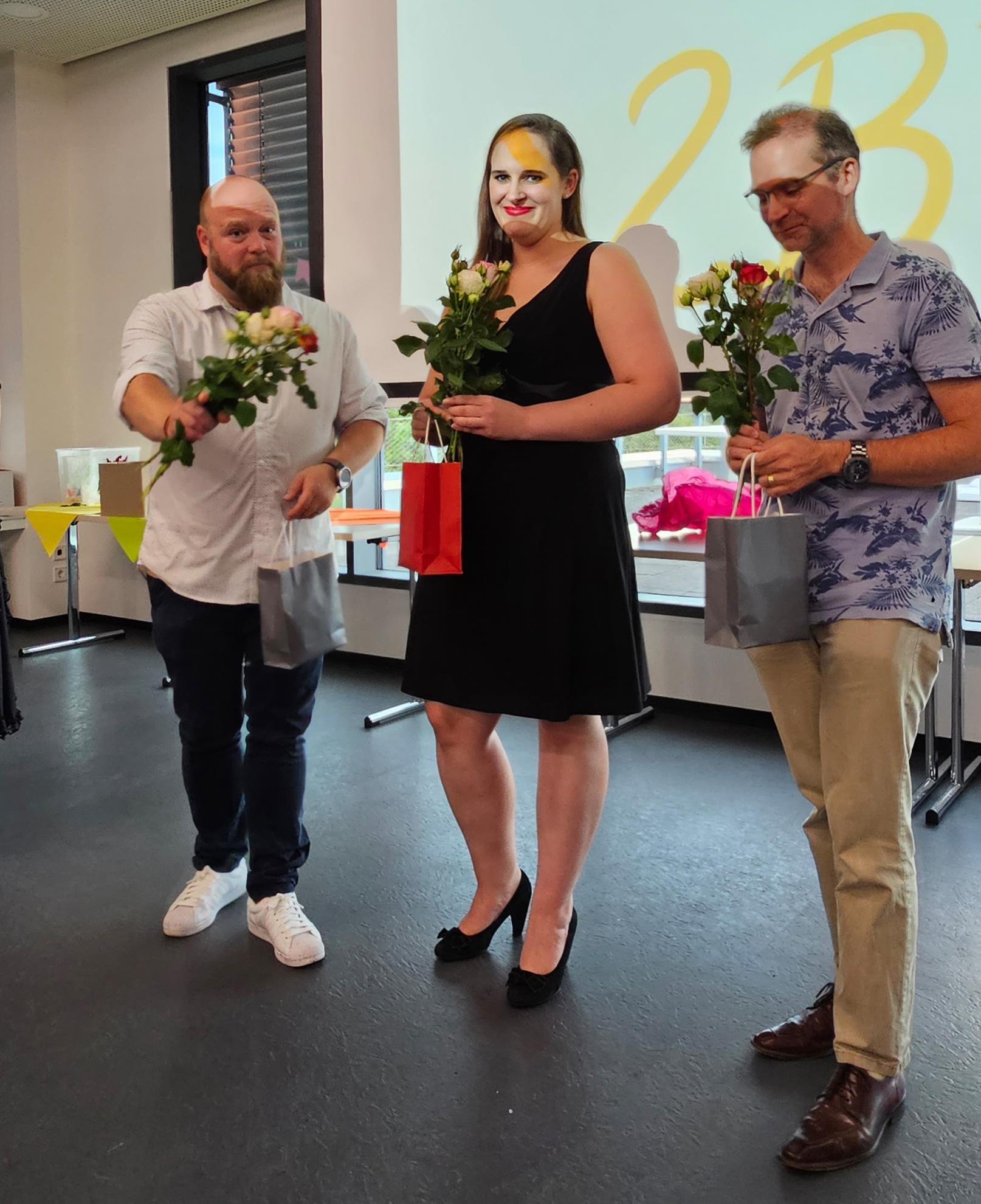 Beide Klassenlehrerinnen sowie die Klassensprecher:innen ließen in ihren Abschlussworten das letzte Schuljahr noch einmal Revue passieren, auch gab es Rosen und Geschenke für die Lehrkräfte. Bei einem kahoot!-Quiz konnten die Schüler:innen noch einmal ihr Wissen über ihre Lernbegleiter:innen unter Beweis stellen.