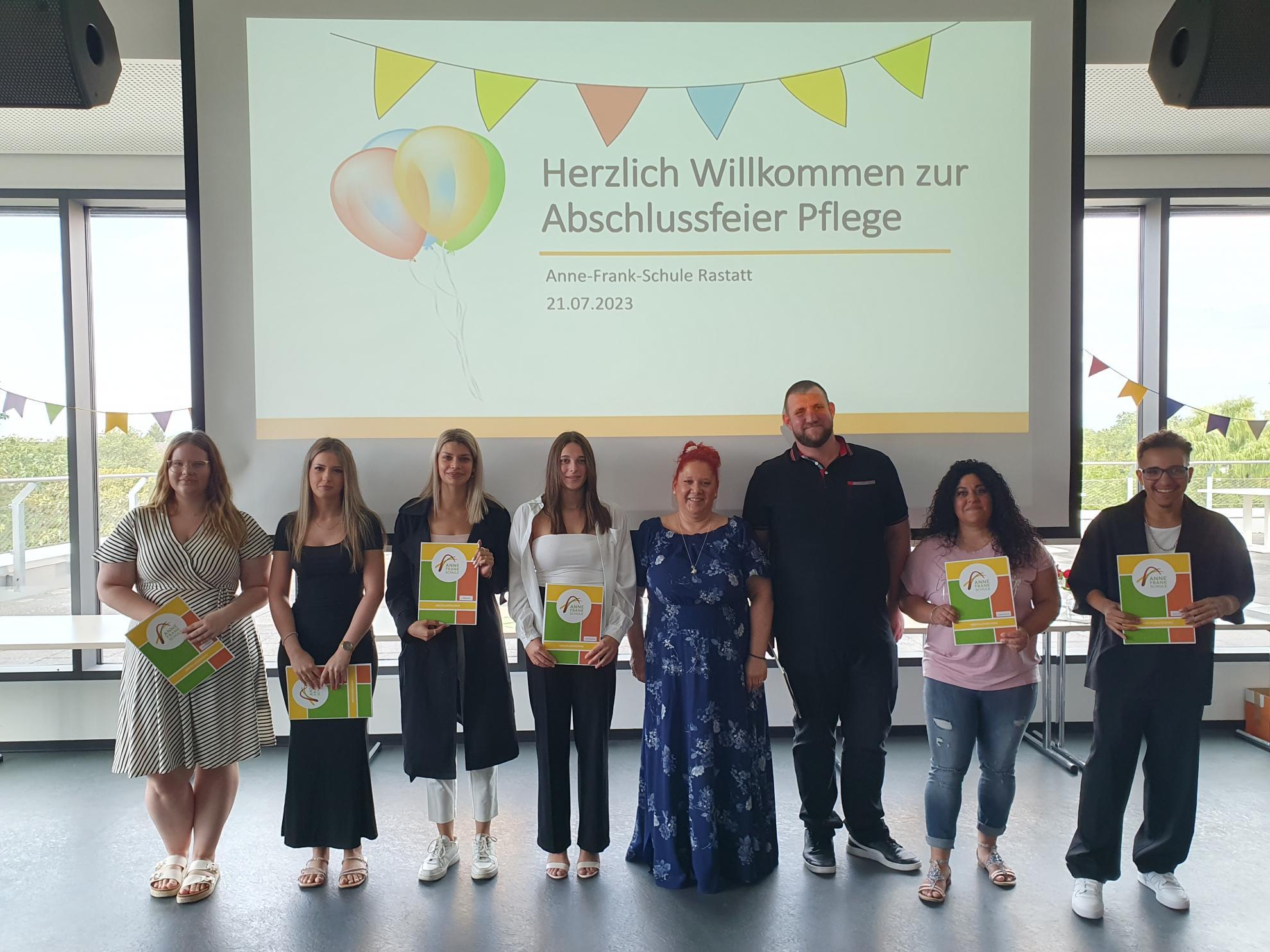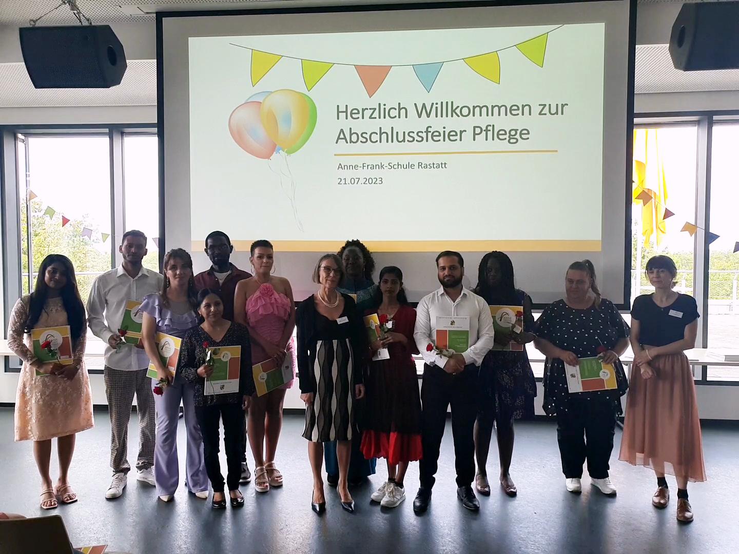 In der Berufsfachschule für Altenpflegehilfe (1BFA) schafften elf Schüler:innen ihren Abschluss, unter denen einige ihren Weg an der Anne-Frank-Schule weitergehen und ihre Ausbildung bei uns machen werden. In der Berufsfachschule für Altenpflegehilfe für Migrantinnen und Migranten (2BFAHM) absolvierten 16 Schüler:innen erfolgreich ihre Ausbildung, während insgesamt 22 Absolvent:innen der Berufsfachschule für Pflege – Pflegefachfrau/-mann (3BFP3) ihre Abschlusszeugnisse entgegennehmen durften.