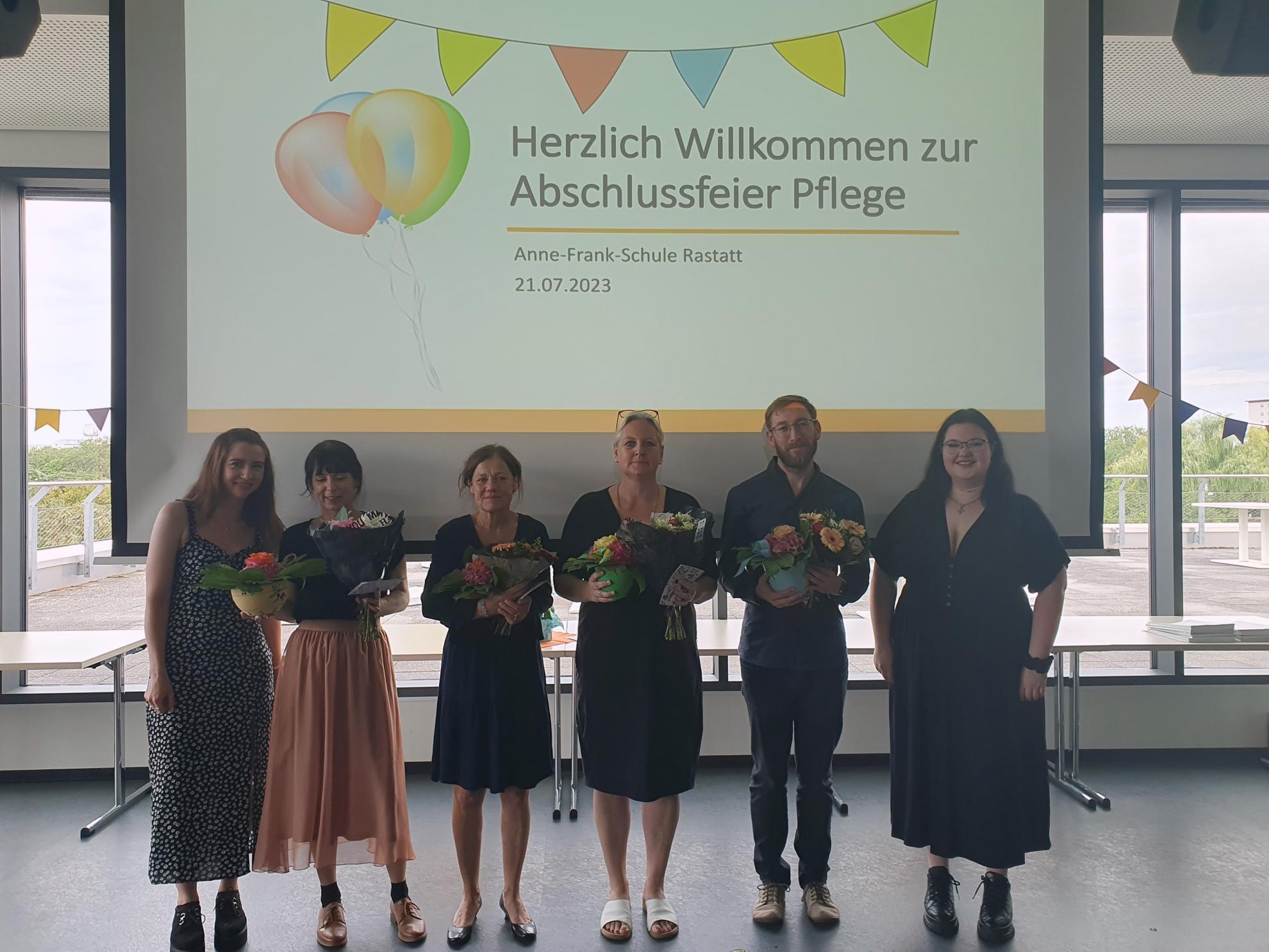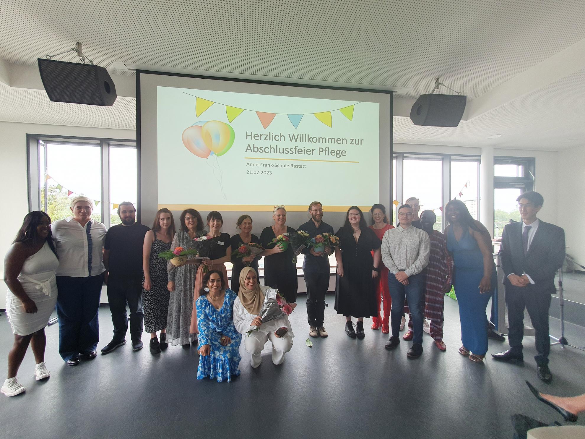 Am vergangenen Freitag, den 21.07.23, herrschte verhältnismäßig reges Treiben im obersten Stockwerk der Anne-Frank-Schule: Der Mensaraum wird auch als Veranstaltungsort genutzt, am Freitagvormittag von der Berufsfachschule für Altenpflegehilfe, der Altenpflegehilfe für Migrantinnen und Migranten und der Berufsfachschule für Altenpflege, die ihren Ausbildungsabschluss feierten.