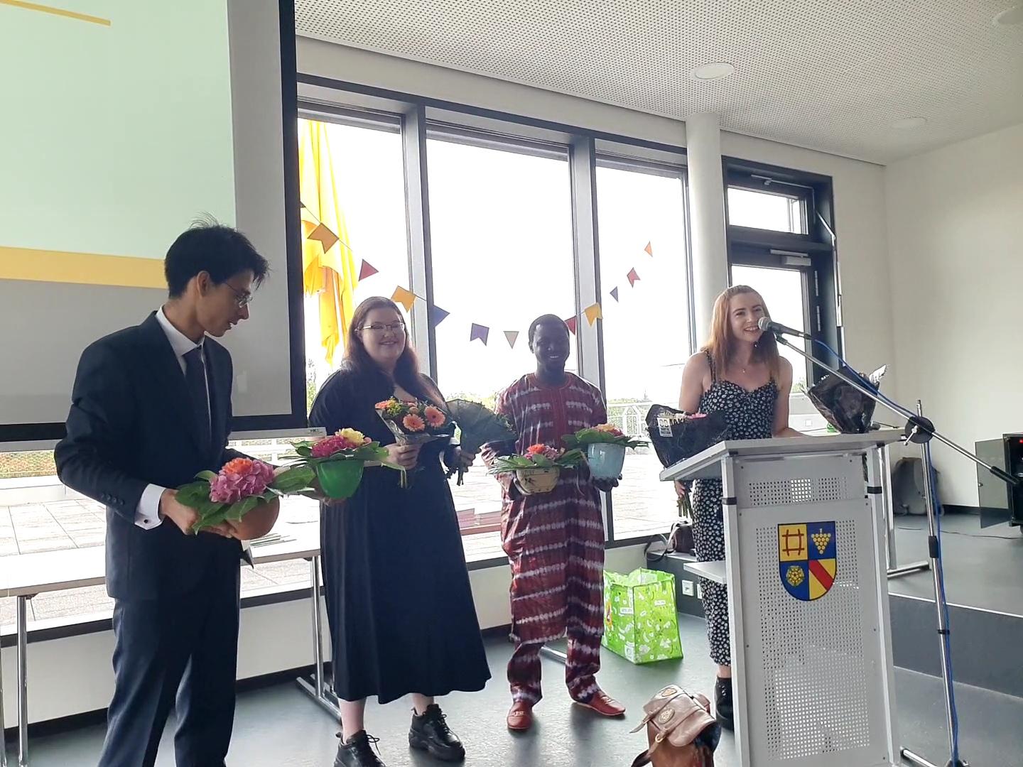 Frau Schleicher und Frau Martini von der 3BFP3 verwiesen in ihrer Danksagungsrede auf ALI – ausatmen, lachen, innehalten – eine Methode, mit der die Klasse die drei Jahre an der Anne-Frank-Schule gemeinsam meistern konnte.