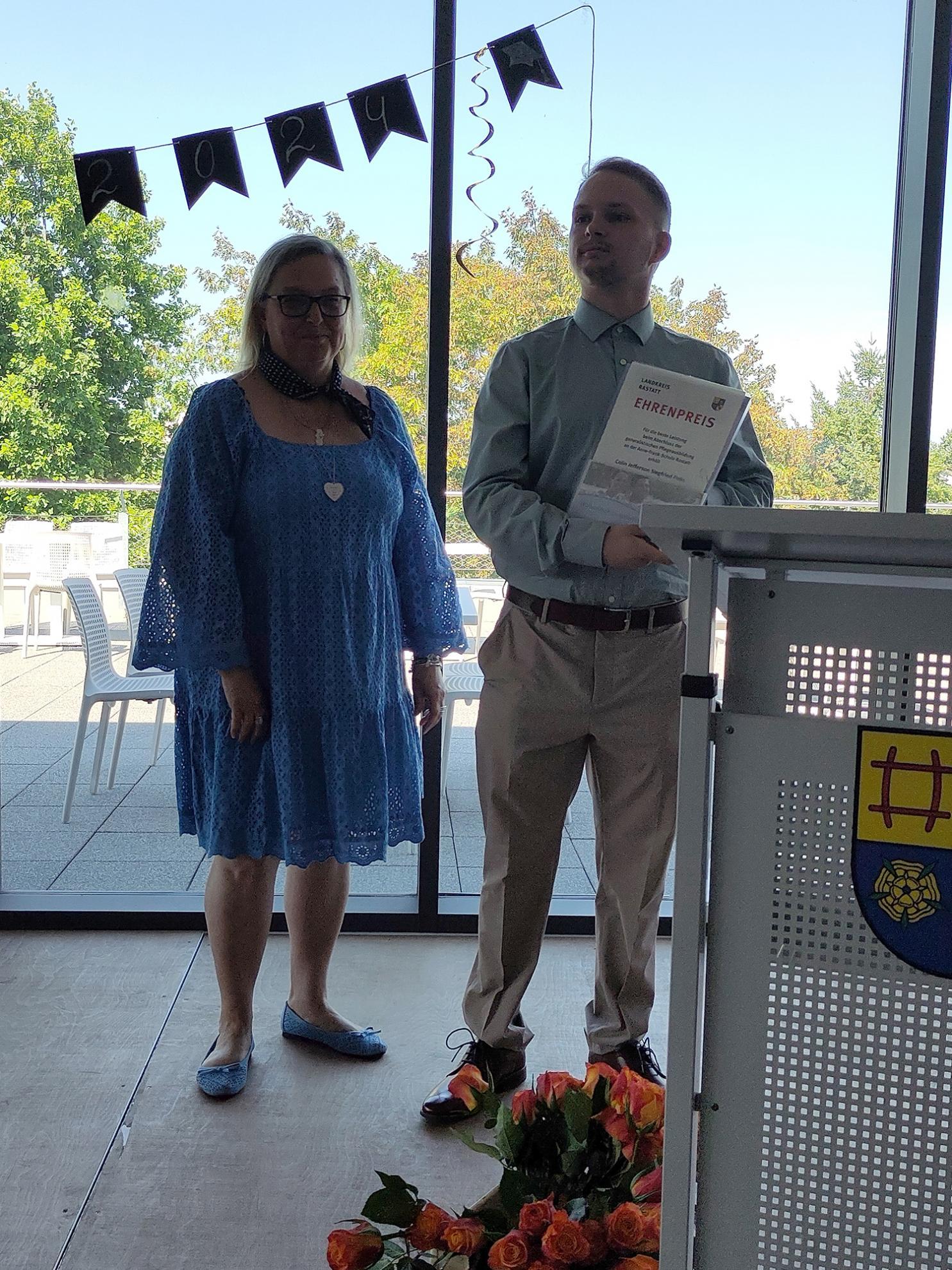 In der Berufsfachschule für Altenpflegehilfe für Migrantinnen und Migranten (2BFAHM2) absolvierten 13 Schüler:innen erfolgreich ihre Ausbildung. Dieser Ausbildungsgang ist ein ganz besonderer, da er nicht überall angeboten wird und außerdem die kulturelle Vielfalt in der Pflege zeigt. Chriss Lalu durfte sich über einen Preis der Schule sowie den Preis des Landratsamts für die beste Gesamtleistung freuen. Weiterhin erhielten Sedina Ustamujic den Preis der AOK für die beste praktische Prüfung sowie Thuong Duong ein Lob für ihre guten Leistungen.