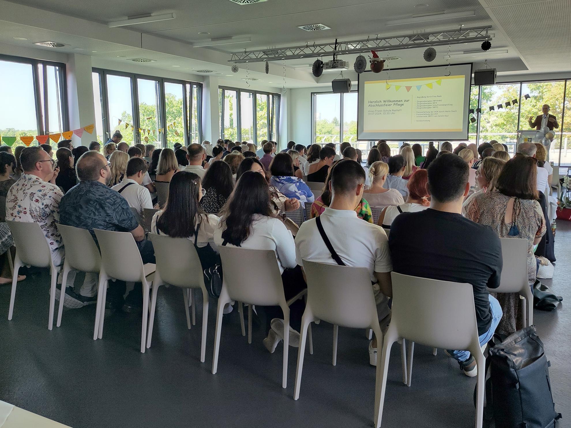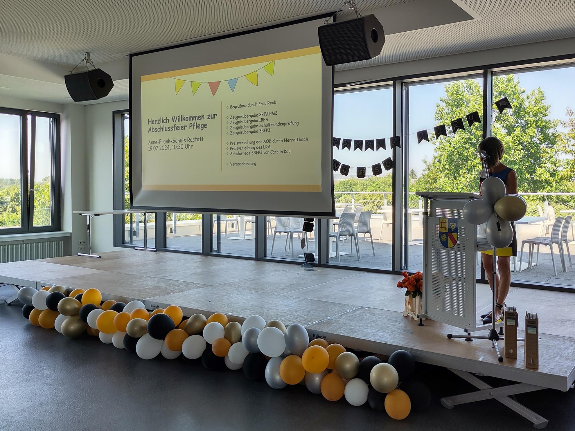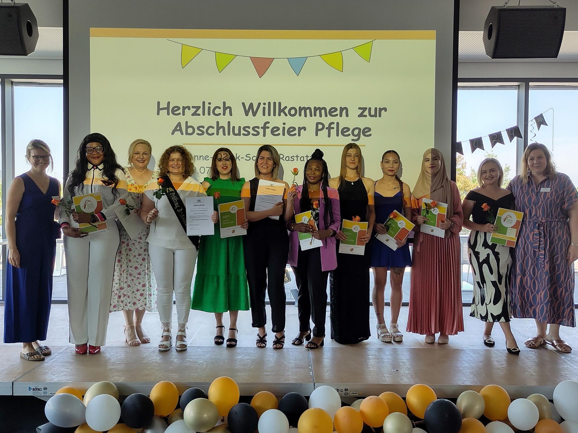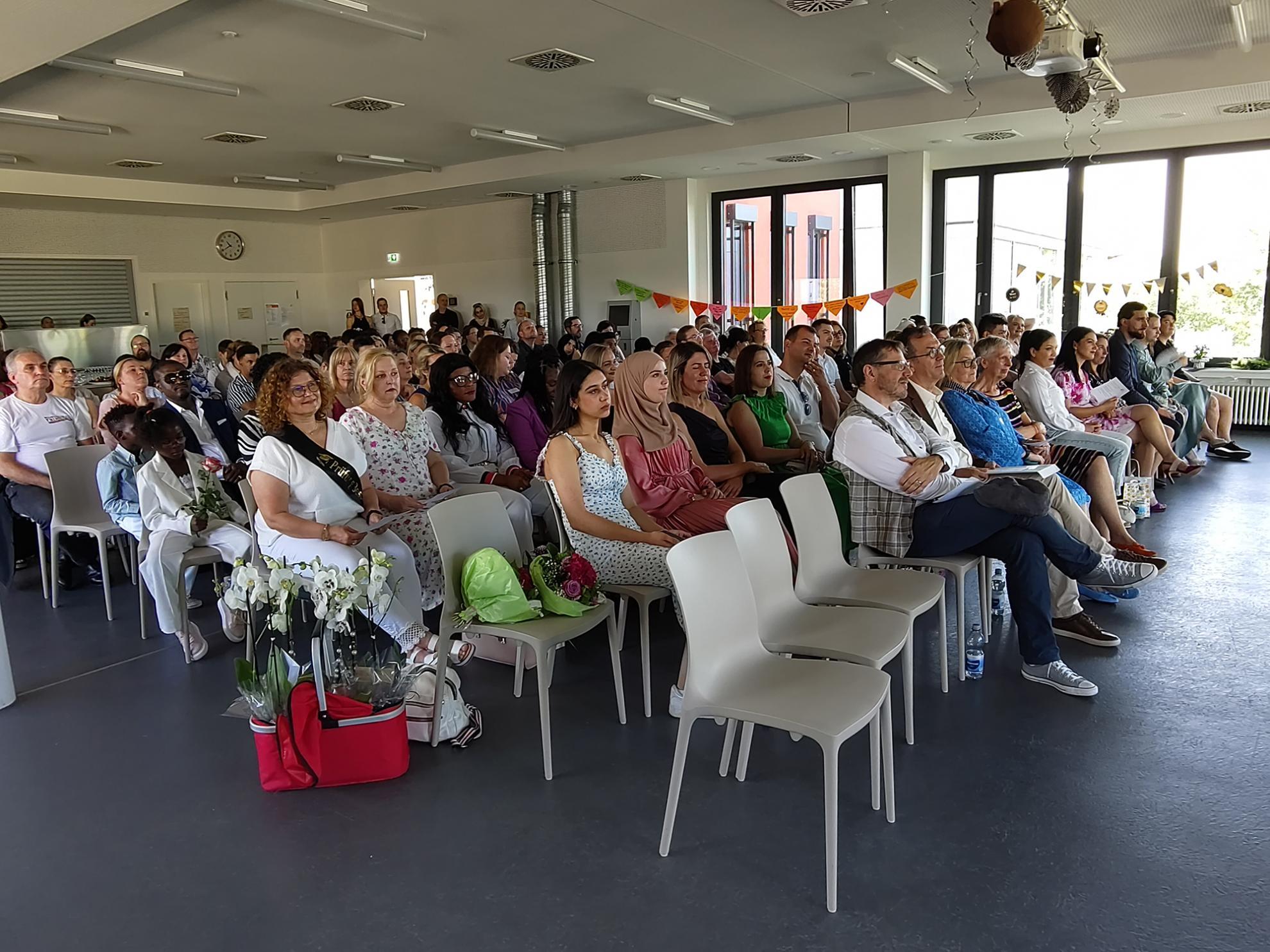 Am vergangenen Donnerstag, den 18.07.24, herrschte verhältnismäßig reges Treiben im obersten Stockwerk der Anne-Frank-Schule, als die Abschlussklassen der Pflege ihren Abschluss feierten. Die Absolvent:innen der Berufsfachschule für Altenpflegehilfe, der Altenpflegehilfe für Migrantinnen und Migranten und der Berufsfachschule für Pflege sorgten gemeinsam mit ihren Familien, Freunden und Lehrkräften für ein volles Haus und gute Stimmung.
