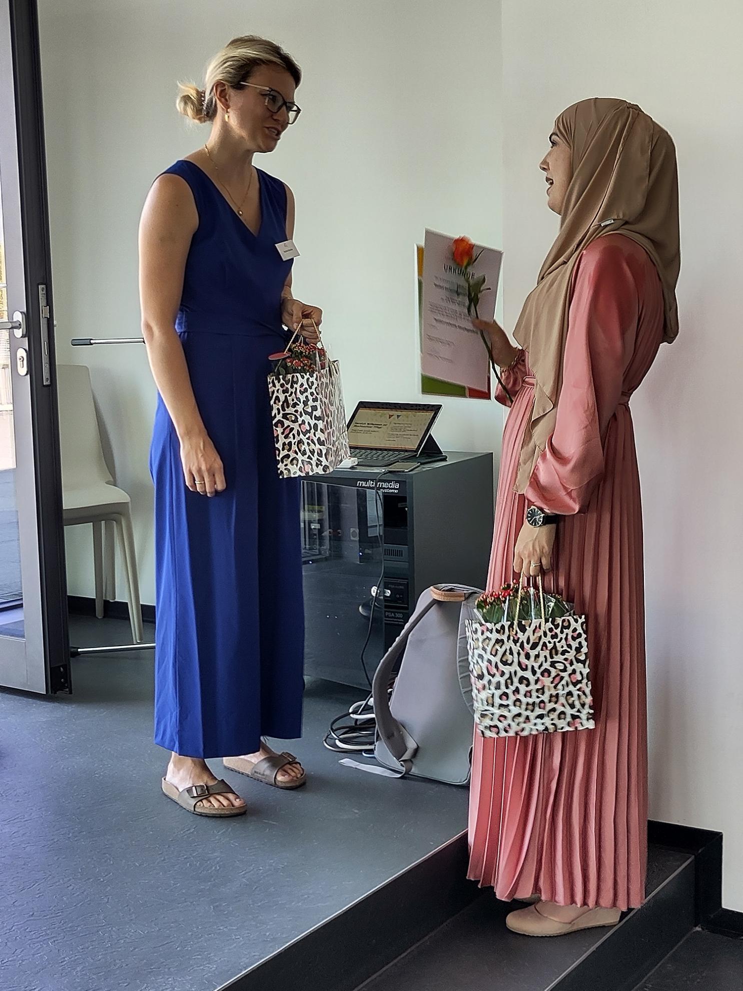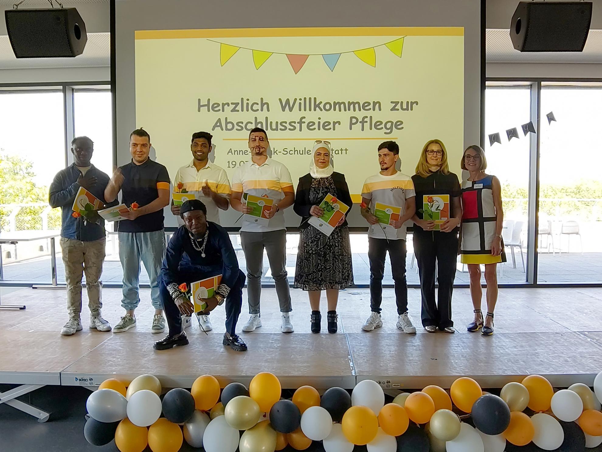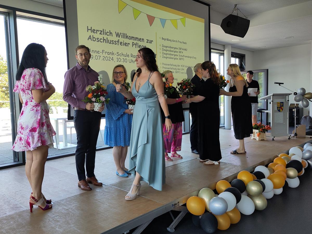 In der Berufsfachschule für Altenpflegehilfe (1BFA) schafften neun Schüler:innen ihren Abschluss, unter denen einige ihren Weg an der Anne-Frank-Schule weitergehen und die generalistischen Ausbildung bei uns machen werden. Chahida Zahoual erhielt den Preis des Landratsamts für die beste Ausbildungsleistung, während sich dieselbe Schülerin gemeinsam mit Gerendine Nguemadjeu sowie Anita Schischefski über ein Lob für ihre guten Leistungen freuen durften.