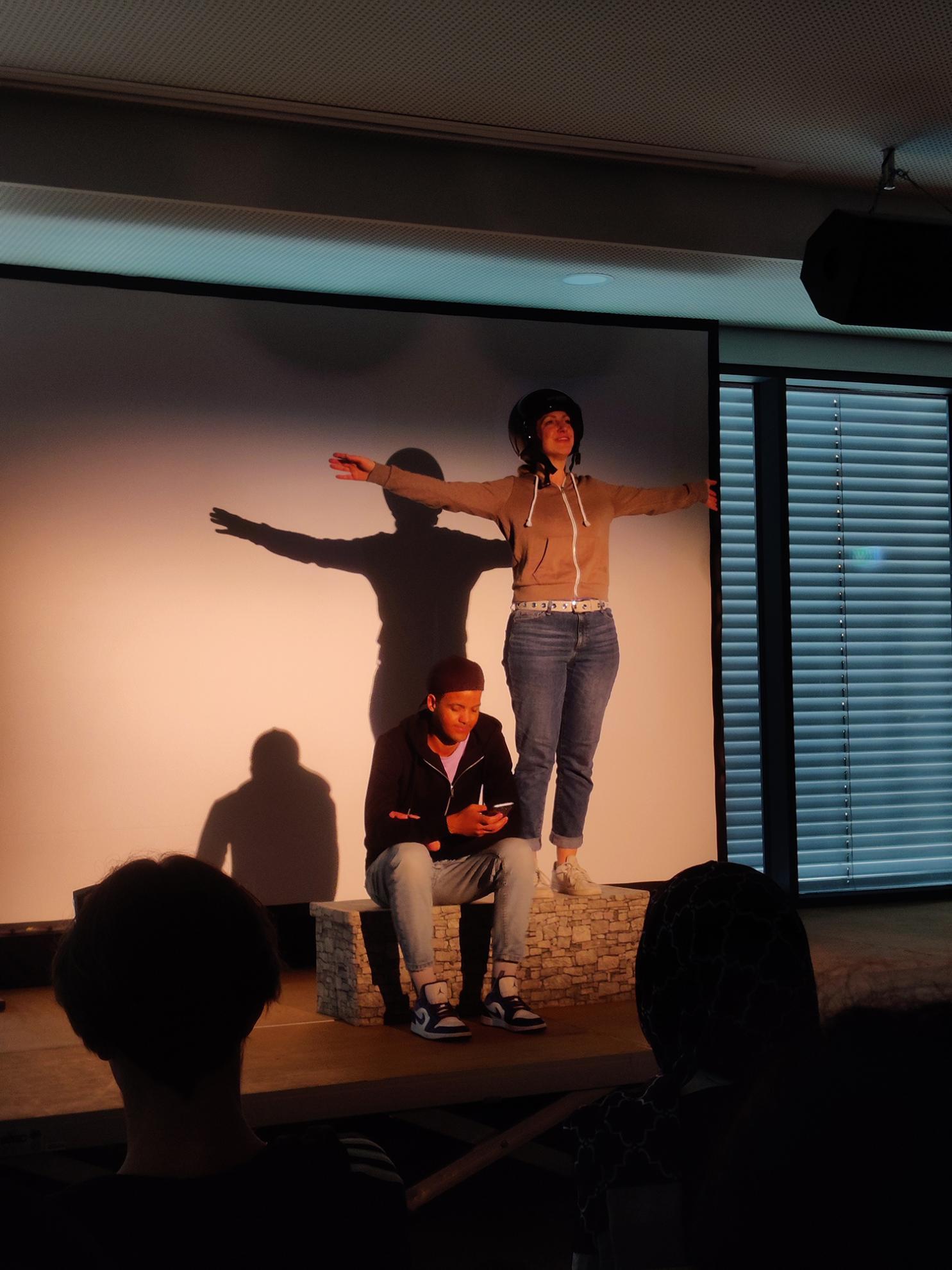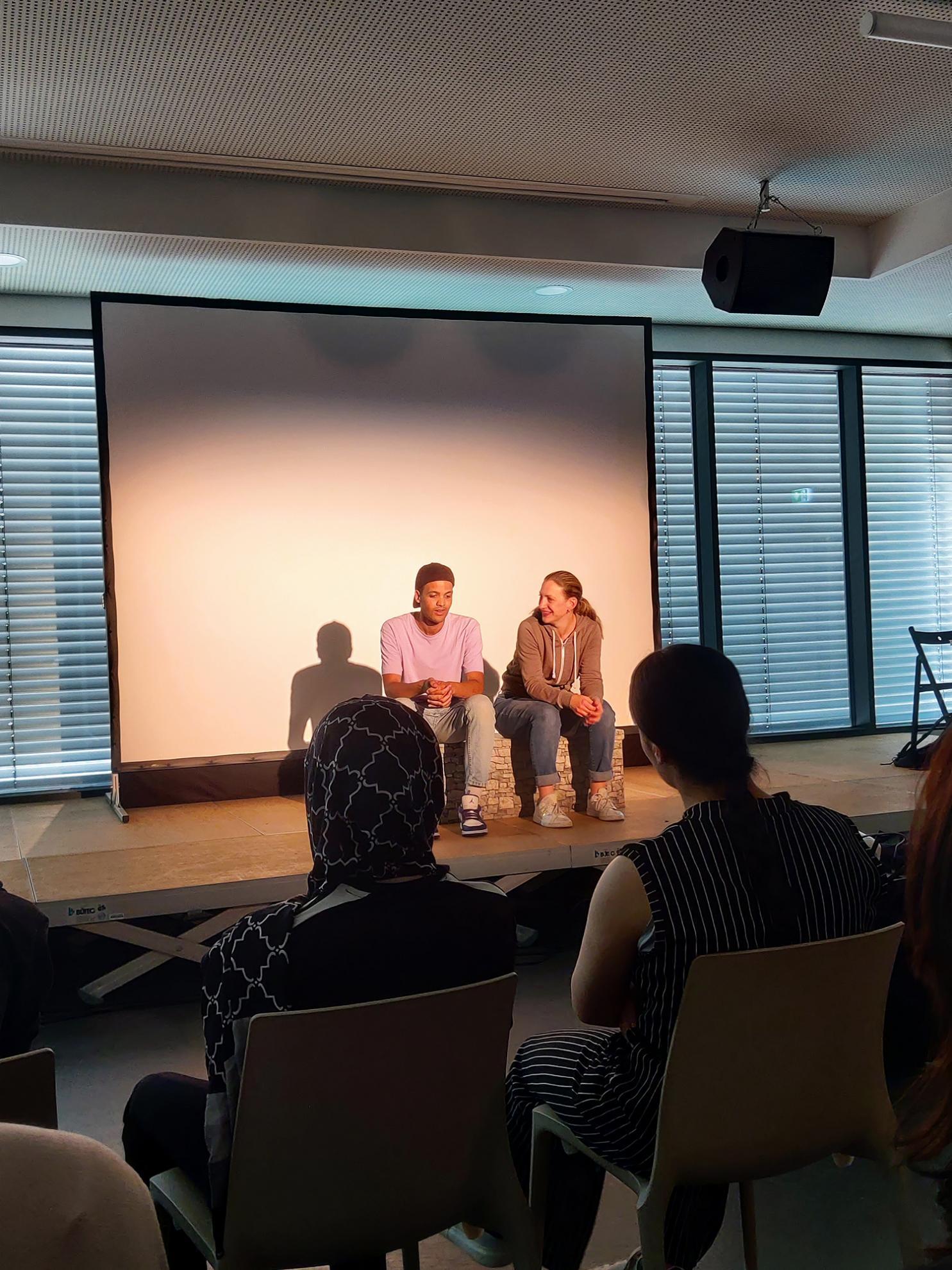 Dabei thematisierten die Schauspieler:innen Ismael und Doro Extremismus und Radikalisierung bei Jugendlichen und ordneten das Aufgeführte zusammen mit den Schüler:innen direkt ein.