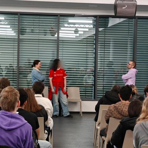 Im Anschluss an die Szenen wurde das Gesehene im Plenum reflektiert und sogar von einigen Schüler:innen gemeinsam mit dem Theaterteam umgestaltet.