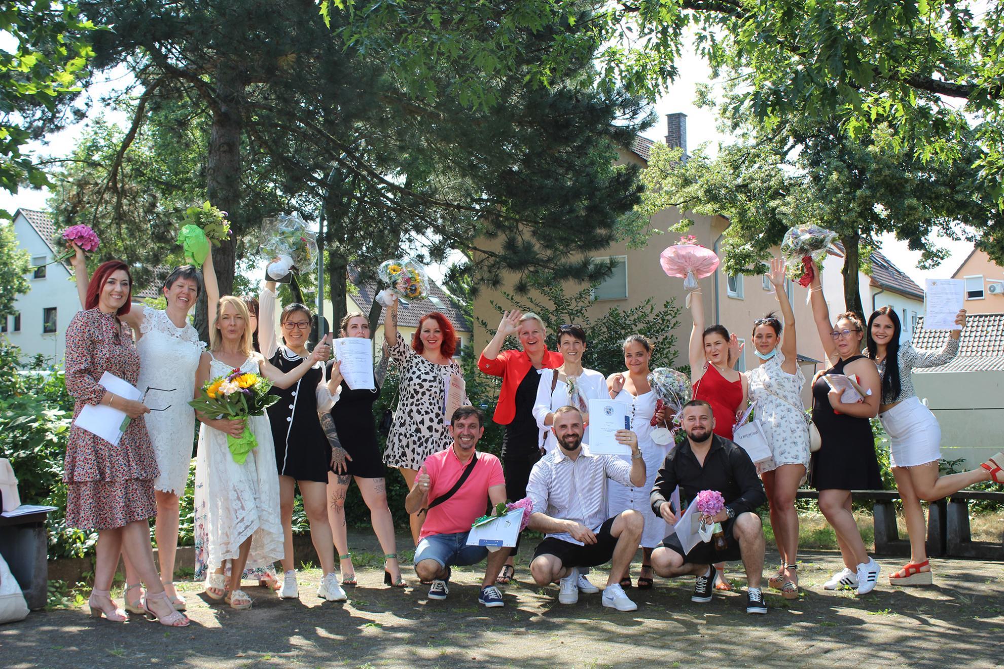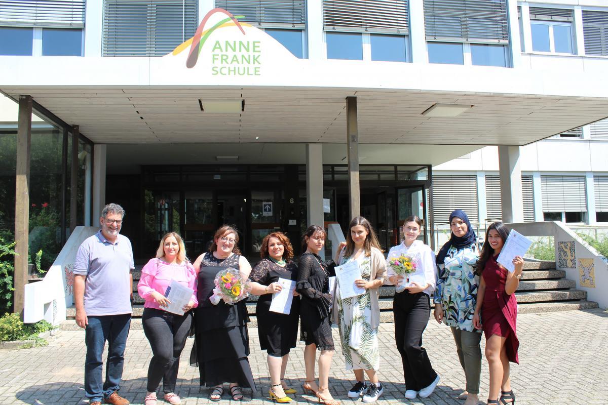Am vergangenen Freitag, den 23. Juli, herrschte verhältnismäßig reges Treiben im obersten Stockwerk der Anne-Frank-Schule: Der Mensaraum wird auch als Veranstaltungsort genutzt, am Freitagvormittag von der Berufsfachschule für Altenpflegehilfe, der Altenpflegehilfe für Migrantinnen und Migranten und der Berufsfachschule für Altenpflege, die ihren Ausbildungsabschluss feierten. Dennoch fand die Veranstaltung in wesentlich kleinerem Rahmen als sonst üblich statt und Hygienevorschriften, Maskenpflicht und Abstandsregeln begleiteten das Fest.