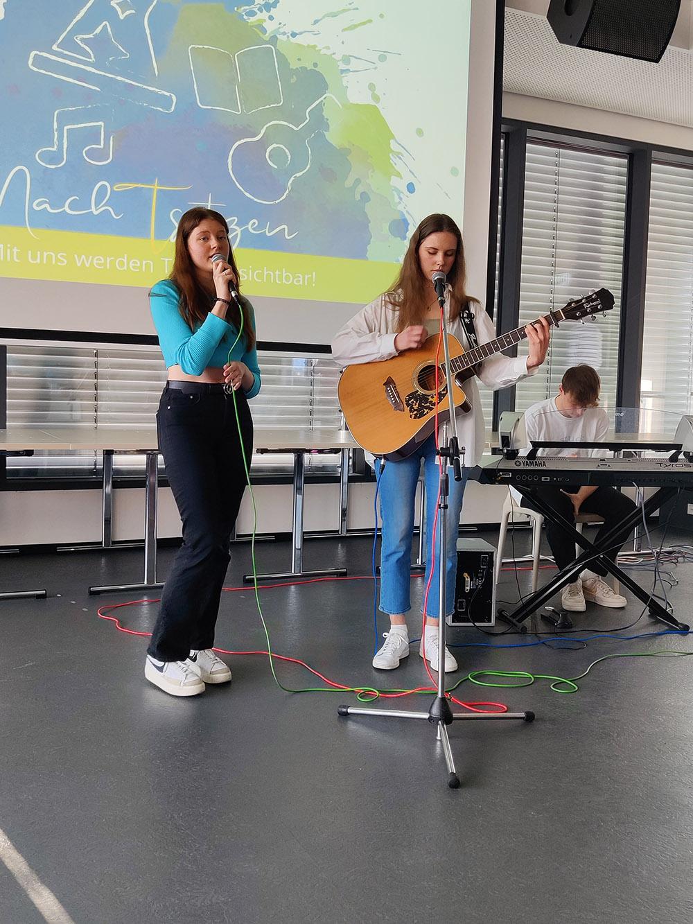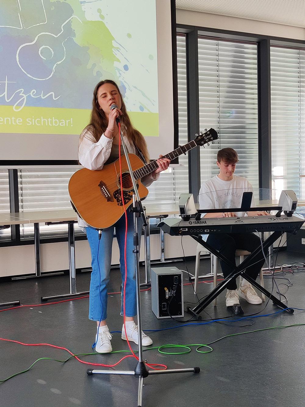 Celina Leucht (GGJ2), Alexia Archipow (SGJ1/1) und Cassian Fritz (SGJ1/2), alle drei Mitglieder unserer neuen Schulband "AFS" - kurz für "Another f***ing school band", spielten aktuellere Hits und einige Klassiker, während sich Celina Mohr (2BFP2) an ein Stück von Adele wagte.