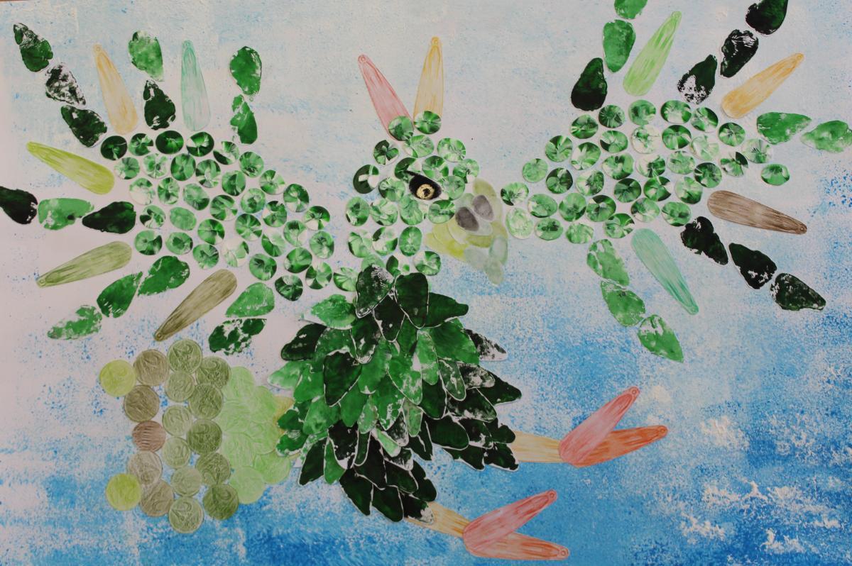 Die Erzieherinnen und Erzieher im letzten Jahr ihrer dreijährigen Ausbildung (Klasse 3BKSPIT3, Fachschule für Sozialpädagogik - praxisorientiert) haben unterschiedliche Drucktechniken wie Körperabdrücke, Materialdruck, Schablonen- oder Stempeldruck ausprobiert und zu fantasievollen Fabelwesen zusammengesetzt.