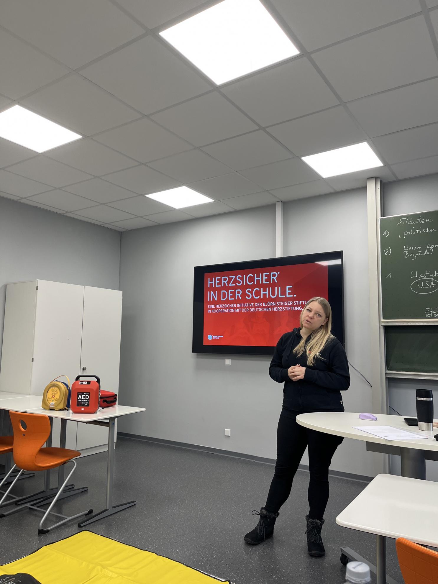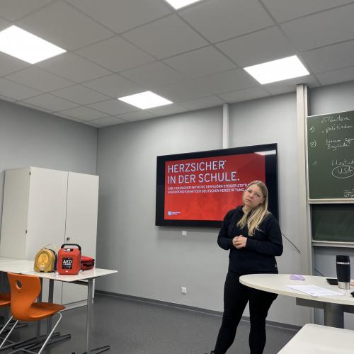 Am vergangenen Montag fand die Schulung von Lehrkräften am automatisierten externen Defibrillator (AED) im Rahmen des von der Björn Steiger Stiftung initiierten Projektes „Herzsicher“ statt. Unsere Schule hat damit Lehrkräfte als Multiplikatorinnen und Multiplikatoren geschult, die nun unsere Schülerinnen und Schüler am AED schulen dürfen. Das Projekt beinhaltet die kostenfreie Bereitstellung eines AED, welches im Eingangsbereich der Anne platziert ist und von Trainingspuppen für die Herzdruckmassage mit Trainings-AED. Wir sagen ganz herzlich „Danke“ an Frau Wohlfahrt von der Björn-Steiger-Stiftung für die Schulung und an Frau Becker von der Schulverwaltung des Landratsamtes für die Vermittlung dieses Angebotes.