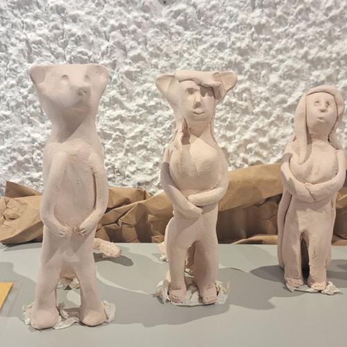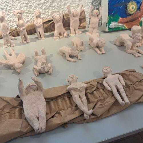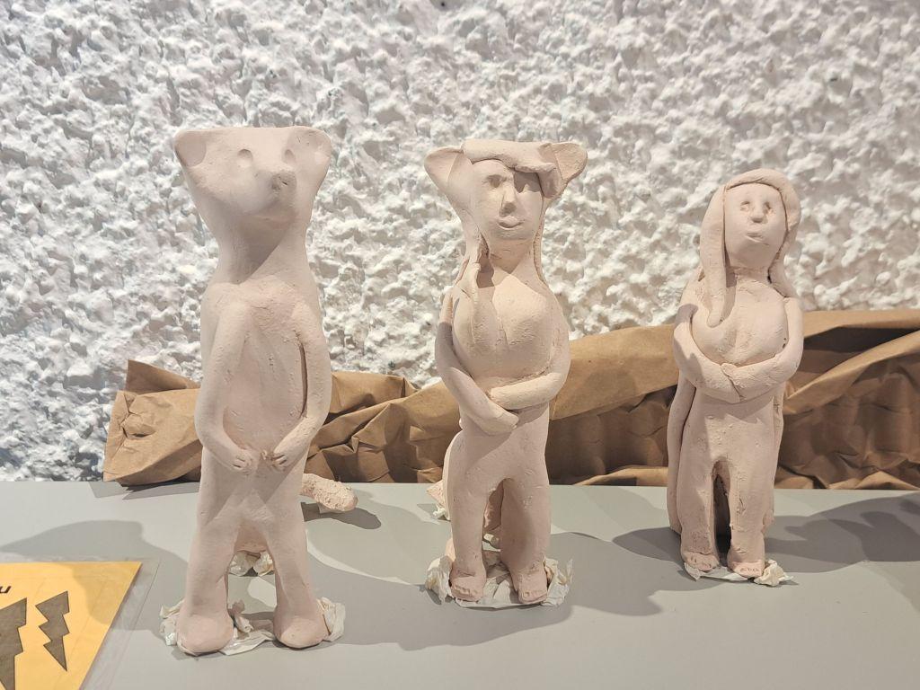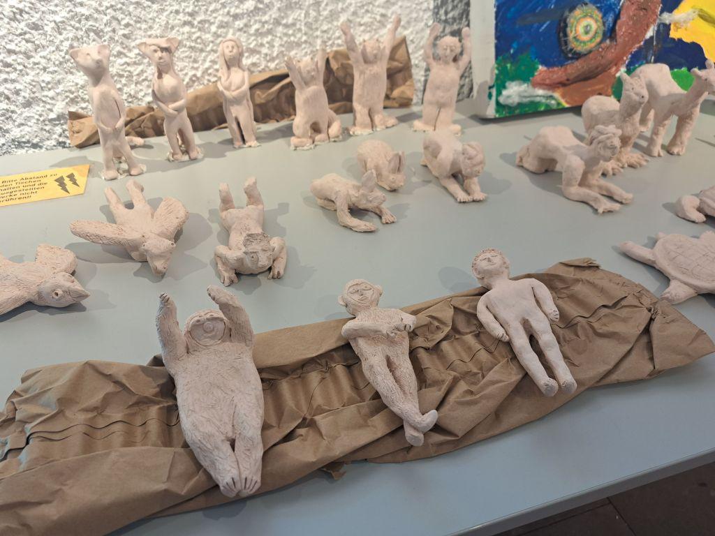 So gestalteten die Schülerinnen der 2BFSA2 eine Serie von drei Plastiken aus Ton, zum Thema Metamorphose. Es verwandelt sich von Figur eins zu Figur drei jeweils ein Tier in einen Menschen.