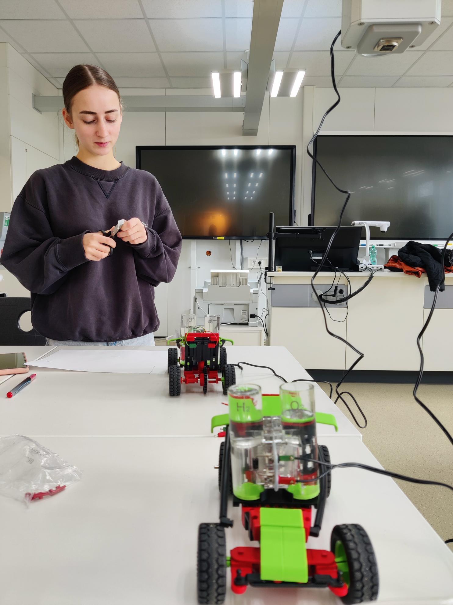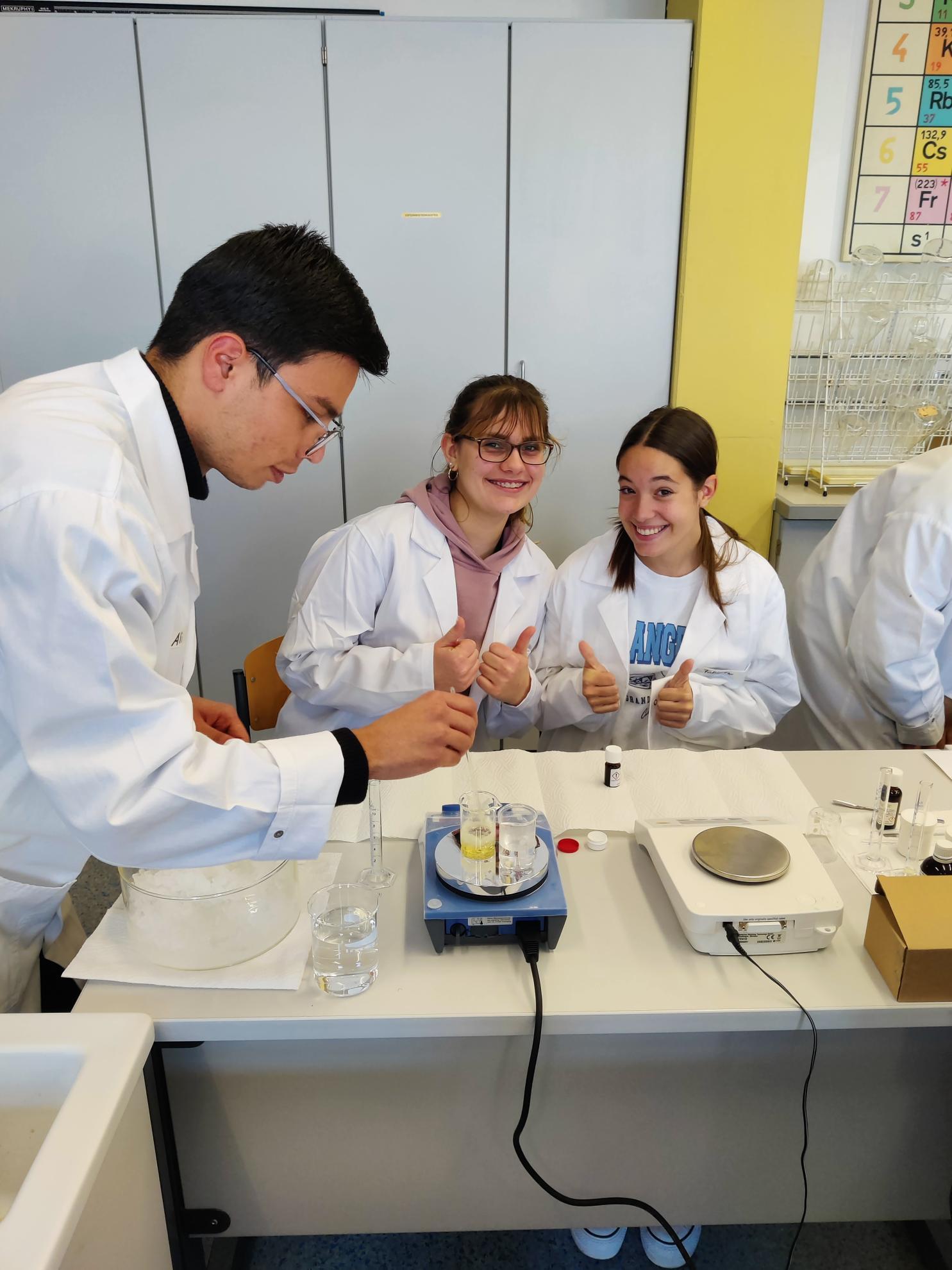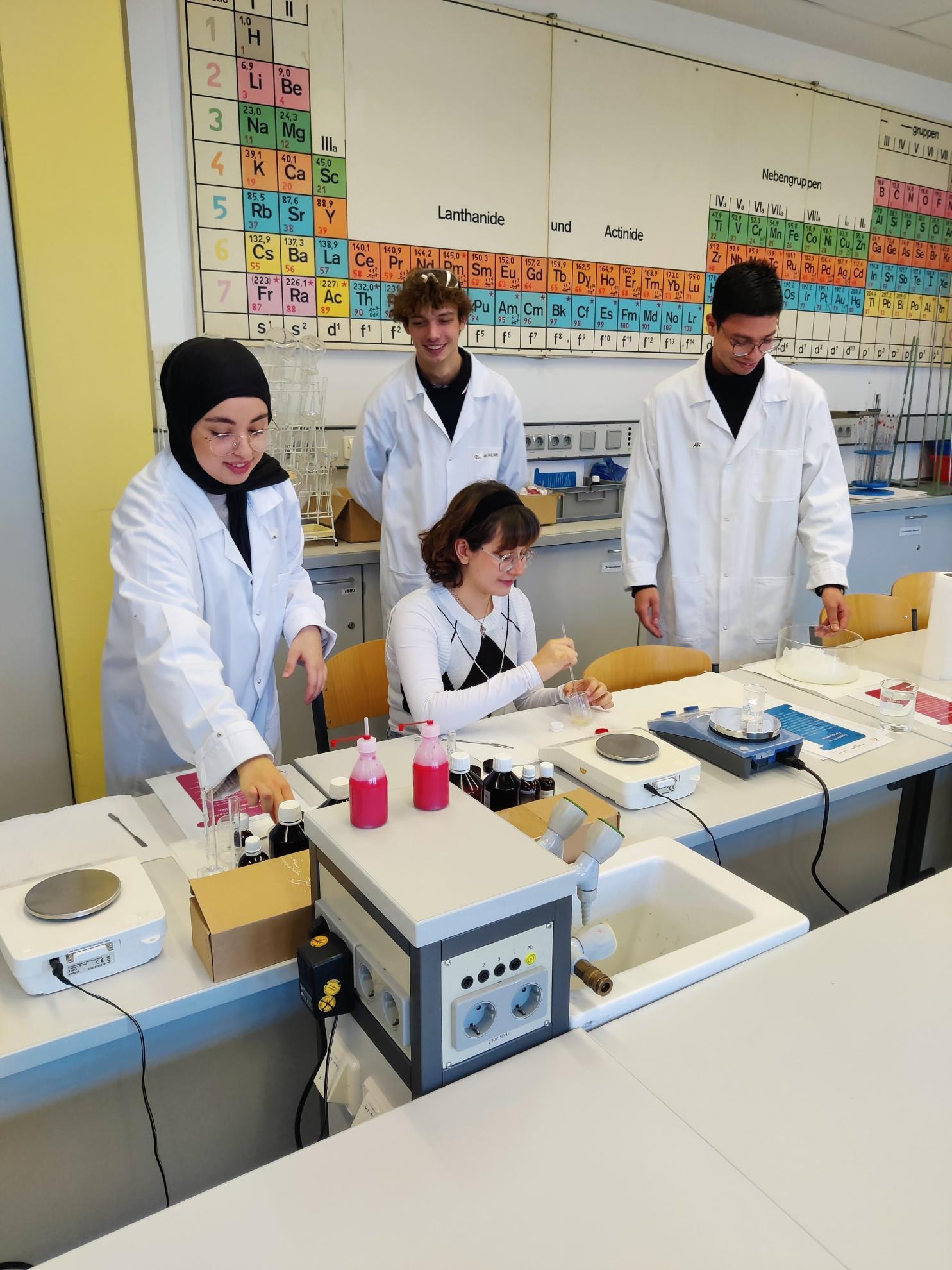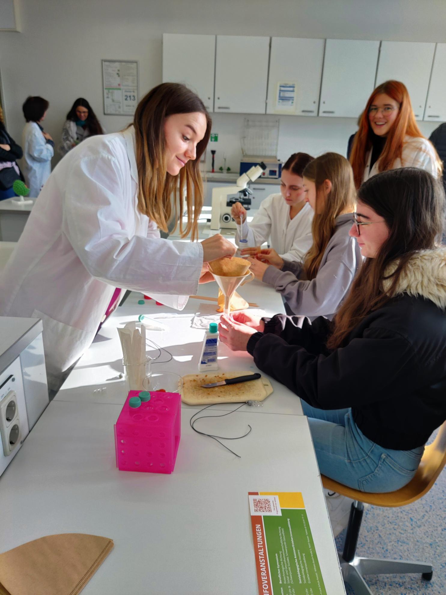 Bei „Genes in an bottle“ konnten die Besucher:innen die DNA einer Tomate isolieren, in einem kleinen Fläschchen mit nach Hause nehmen und dabei das Biotechnologische Gymnasium näher kennenlernen. Das Gesundheitswissenschaftliche Gymnasium bot die Herstellung eigener Pflegeprodukte wie Handcreme und Lippenstift an und gab gleichzeitig gute Einblicke in die Inhalte des Hauptfachs „Gesundheit und Biologie“. Die Schüler:innen des Fachs NEXT präsentierten ein selbst aufgebautes Wasserstoffauto und erklärten die Theorie dahinter, während beim Oberstufenkurs Physik ein aus LEGO gebauter Drucker zu bewundern war. Ein Überblick über die Lehrinhalte des Profilfachs „Pädagogik und Psychologie“ war zudem in der Ausstellung des Sozialwissenschaftlichen Gymnasiums zu gewinnen. Die Fremdsprachenlehrkräfte stellten mit Französisch, Italienisch und Spanisch nicht nur das Fremdsprachenangebot der Schule vor, sondern informierten auch über die Möglichkeiten zum Schüler:innenaustausch im europäischen Sprachraum.