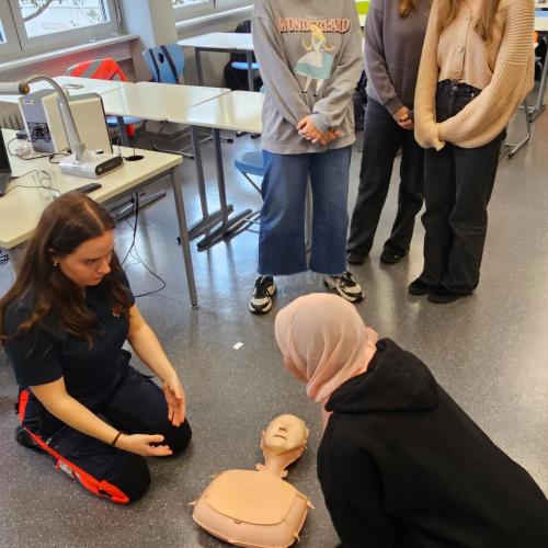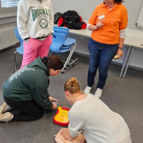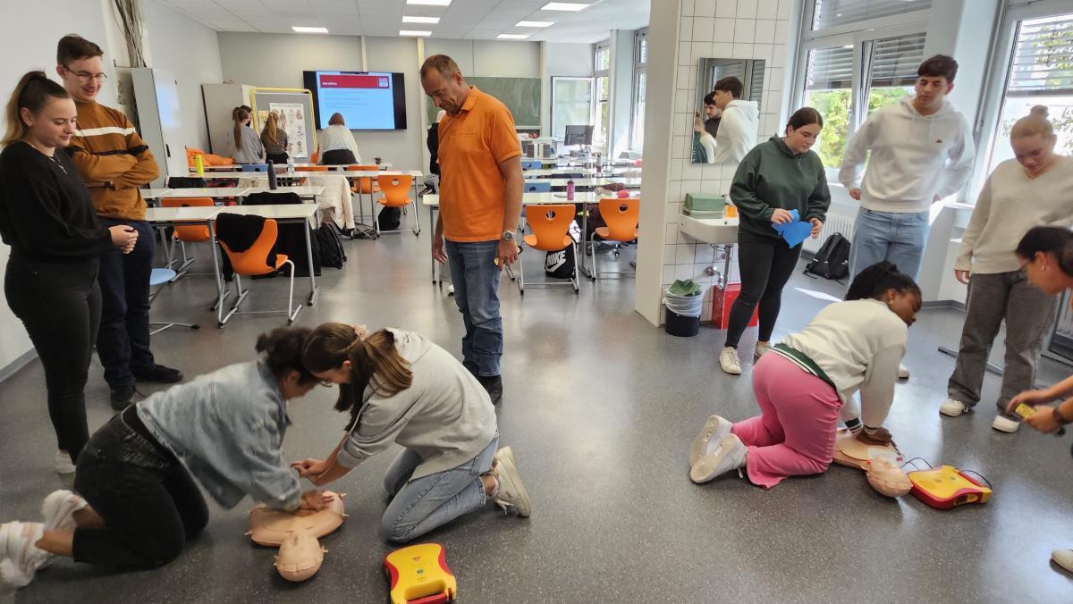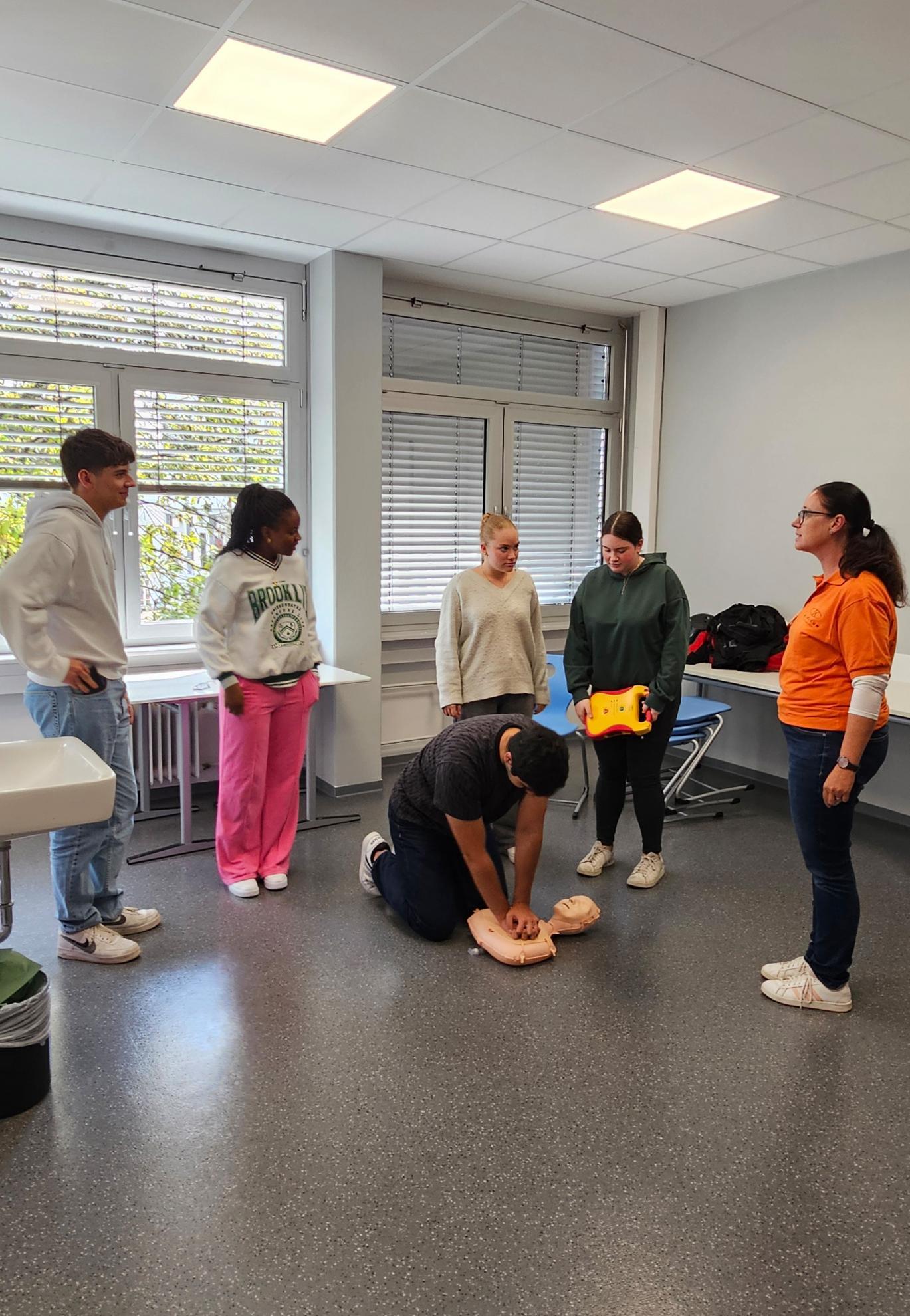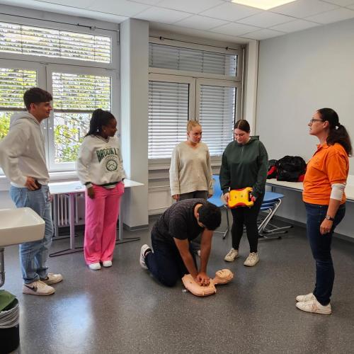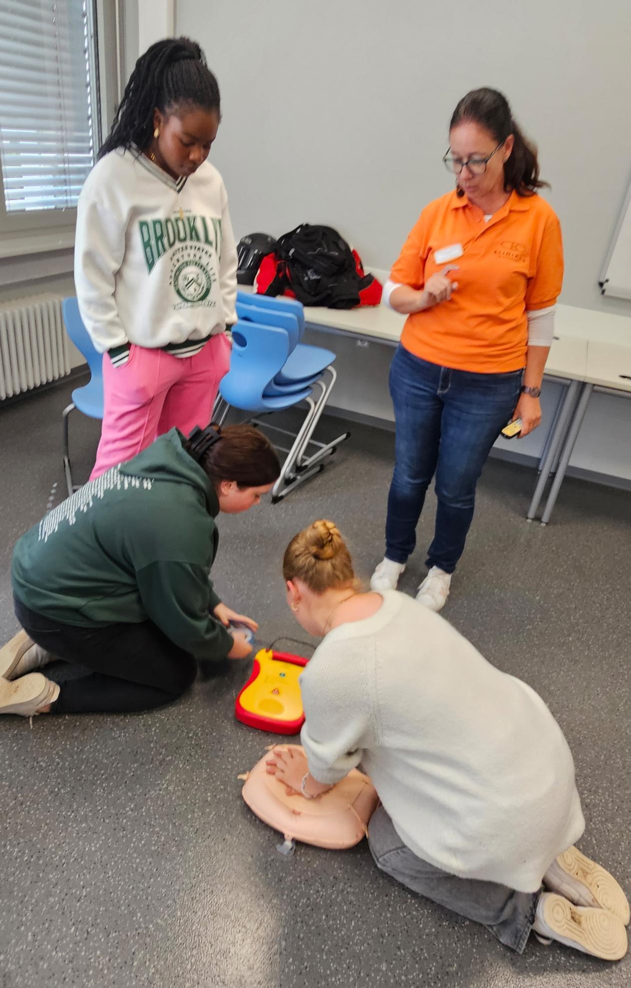 Ende September fand bei uns die Aktionswoche „Woche der Wiederbelebung“ statt. Im Rahmen der Kampagne „Ein Leben retten. 100 Pro Reanimation." lernten unsere Schüler:innen, lebensbedrohliche Zustände zu erkennen, lebensrettende Sofortmaßnahmen wie Herzdruckmassagen auszuführen oder einen automatischen Defibrillator zu benutzen.