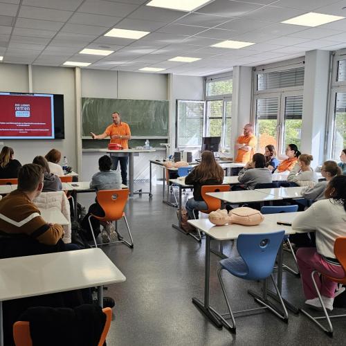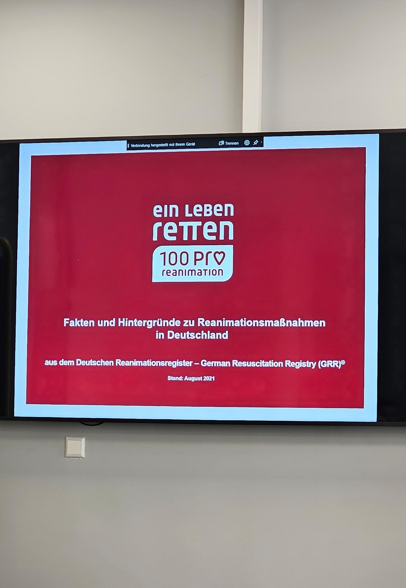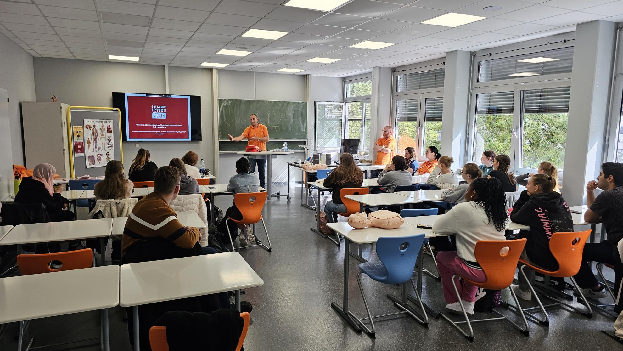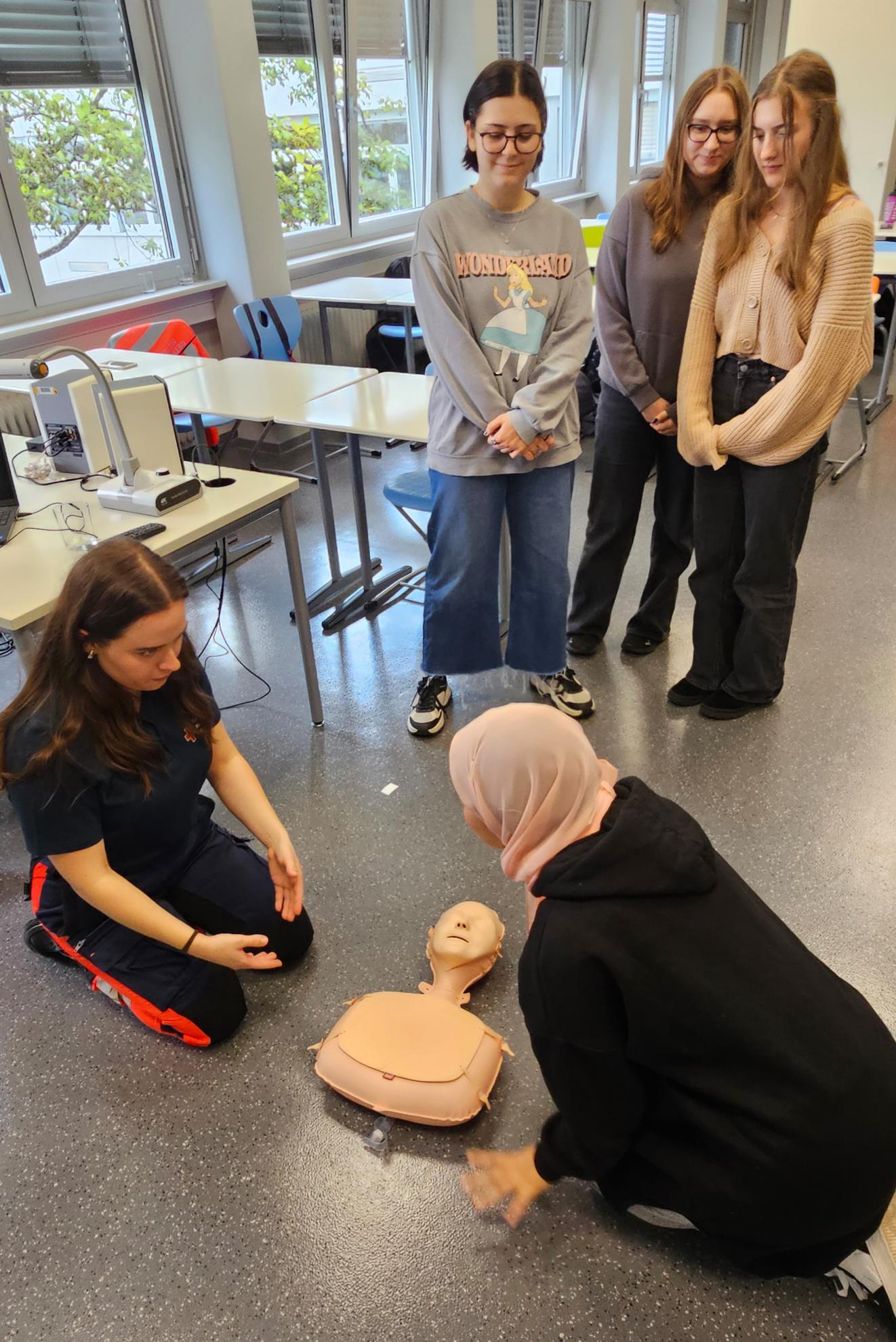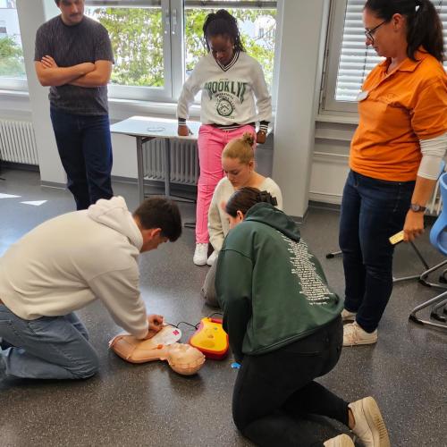 Ende September fand bei uns die Aktionswoche „Woche der Wiederbelebung“ statt. Im Rahmen der Kampagne „Ein Leben retten. 100 Pro Reanimation." lernten unsere Schüler:innen, lebensbedrohliche Zustände zu erkennen, lebensrettende Sofortmaßnahmen wie Herzdruckmassagen auszuführen oder einen automatischen Defibrillator zu benutzen.