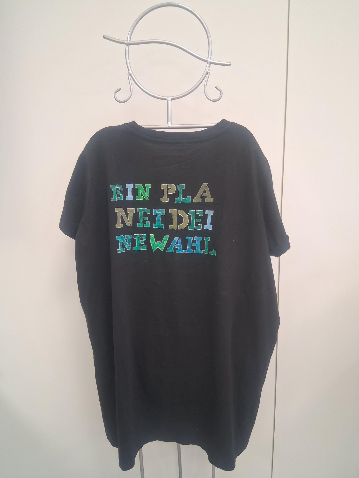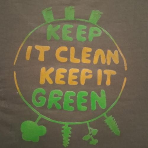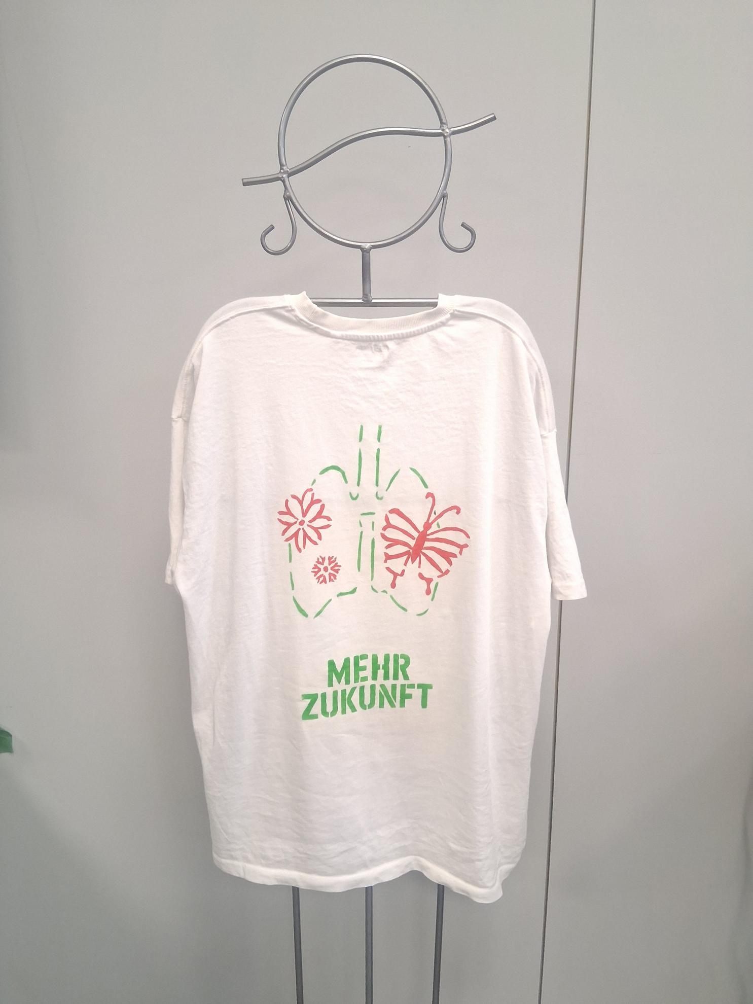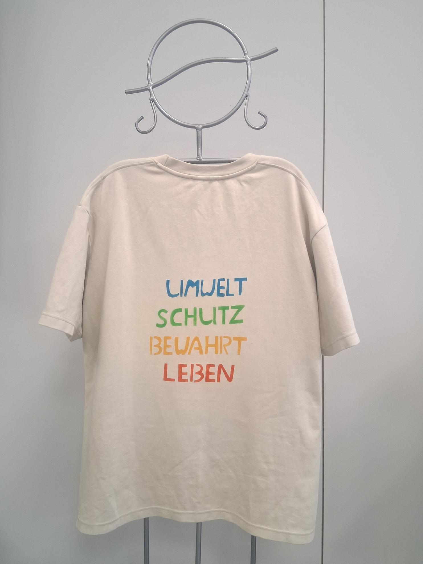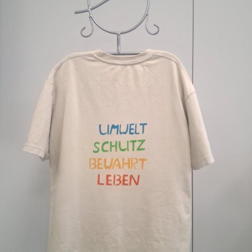 Im Wahlpflichtfach beschäftigten sich die Auszubildenden mit dem Thema Ökologie und Nachhaltigkeit als Bildungsziele. Es sollte ein textiler Gegenstand mit einem selbst entworfenen Stencildruck gestaltet werden, der Bild und Text enthält und zum Nachdenken anregt.