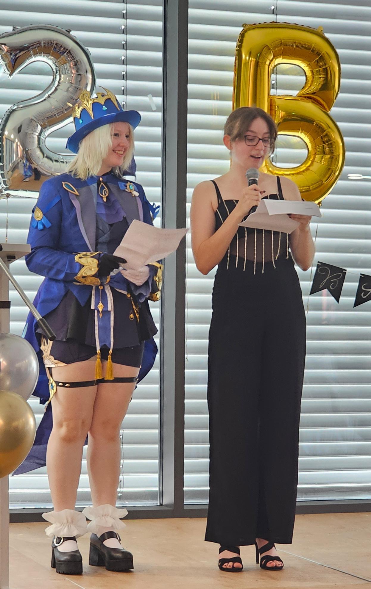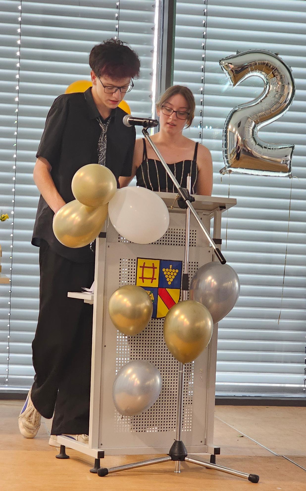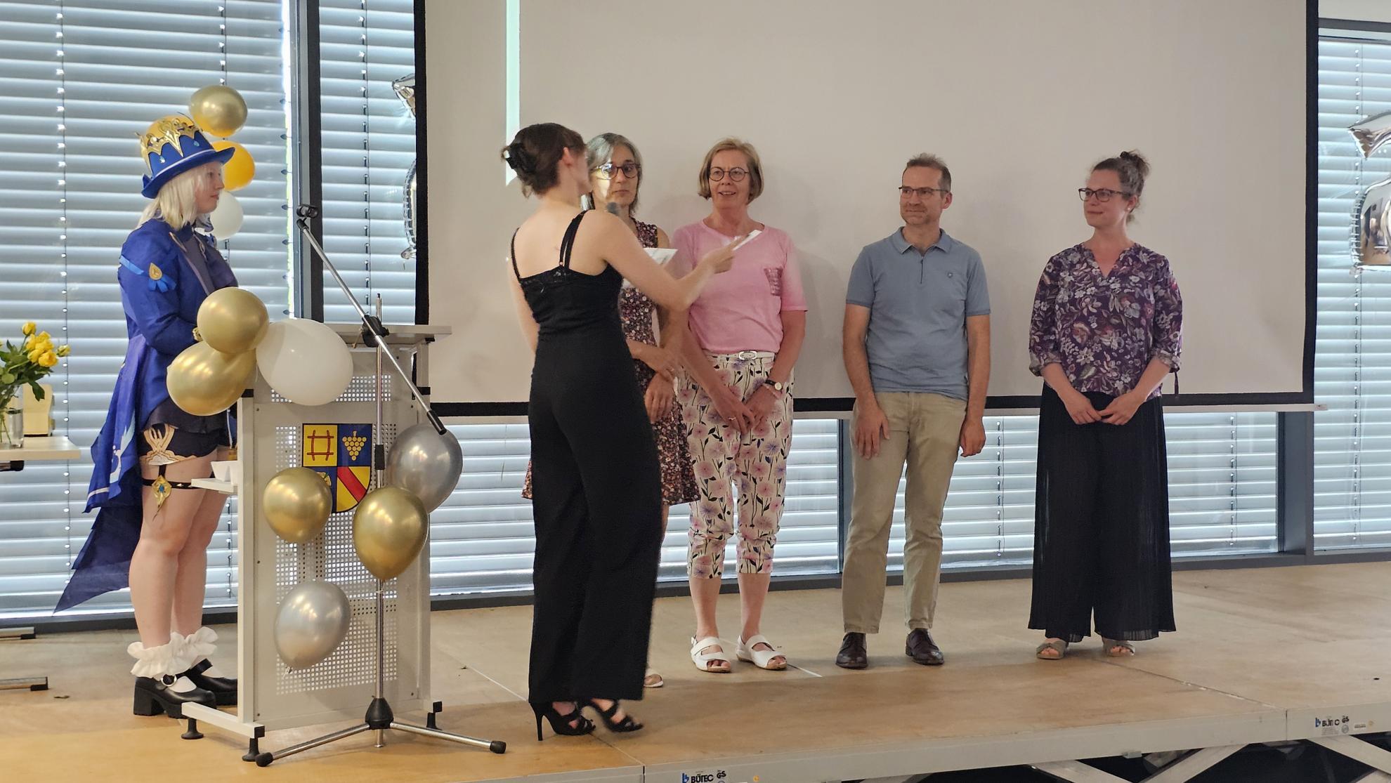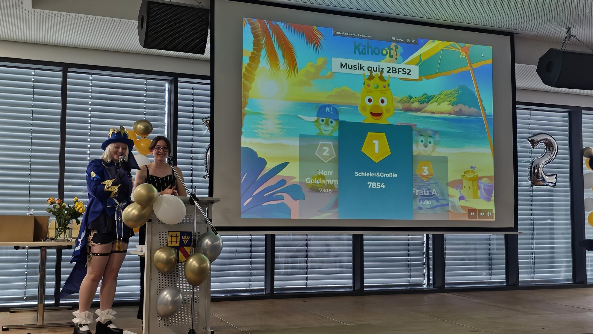 Nach abschließenden Dankesworten des Abteilungsleiters der Zweijährigen Berufsfachschule Hartmut Kühlmann ließen auch die Klassensprecher:innen in ihren Abschlussworten das letzte Schuljahr noch einmal Revue passieren und bedankten sich insbesondere bei Frau Merkel sowie Herrn Schieler. Bei einem kahoot!-Quiz durften dieses Mal die Lehrkräfte gegeneinander antreten und Kinderfotos ihrer Schüler:innen zuordnen sowie ihr Wissen über Musik in Beweis stellen. Die 2BFH2 verteilte außerdem Urkunden für besondere Leistungen an ihre Mitschüler:innen, etwa für gute Unterhaltung, besonders hohes Alter oder Make-up-Artistik. Die Eltern der 2BFP2, vertreten durch Frau Schlager und Frau Kuhn, bedankten sich bei den Lehrkräften mit anerkennenden Worten und einem kleinen Geschenk.