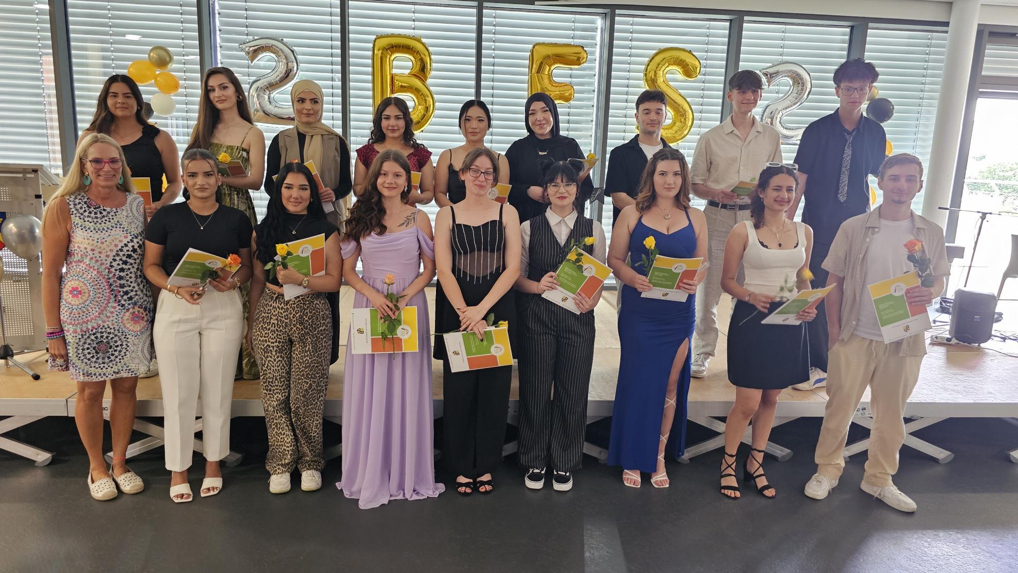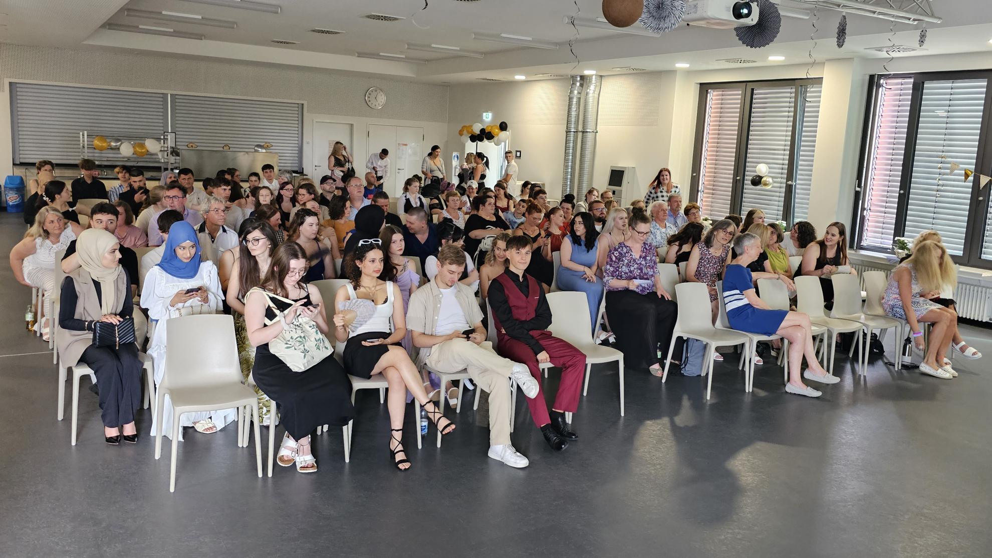 Am vergangenen Donnerstag, den 12.07.2023, fand die Zeugnisübergabe für die Zweijährige Berufsfachschule statt. Insgesamt 26 Schüler:innen aus den Profilen „Gesundheit und Pflege“ sowie „Ernährung und Hauswirtschaft“ haben ihren Schulabschluss mit Fachschulreife geschafft und fanden sich am Donnerstagabend in unserem Mehrzweckraum „mensa&more“ ein, um gemeinsam mit ihren Familien und Lehrkräften ihren Abschluss zu feiern.