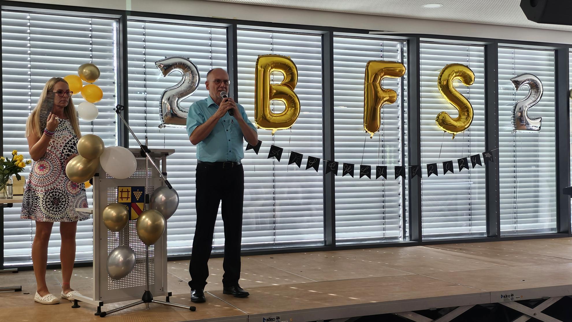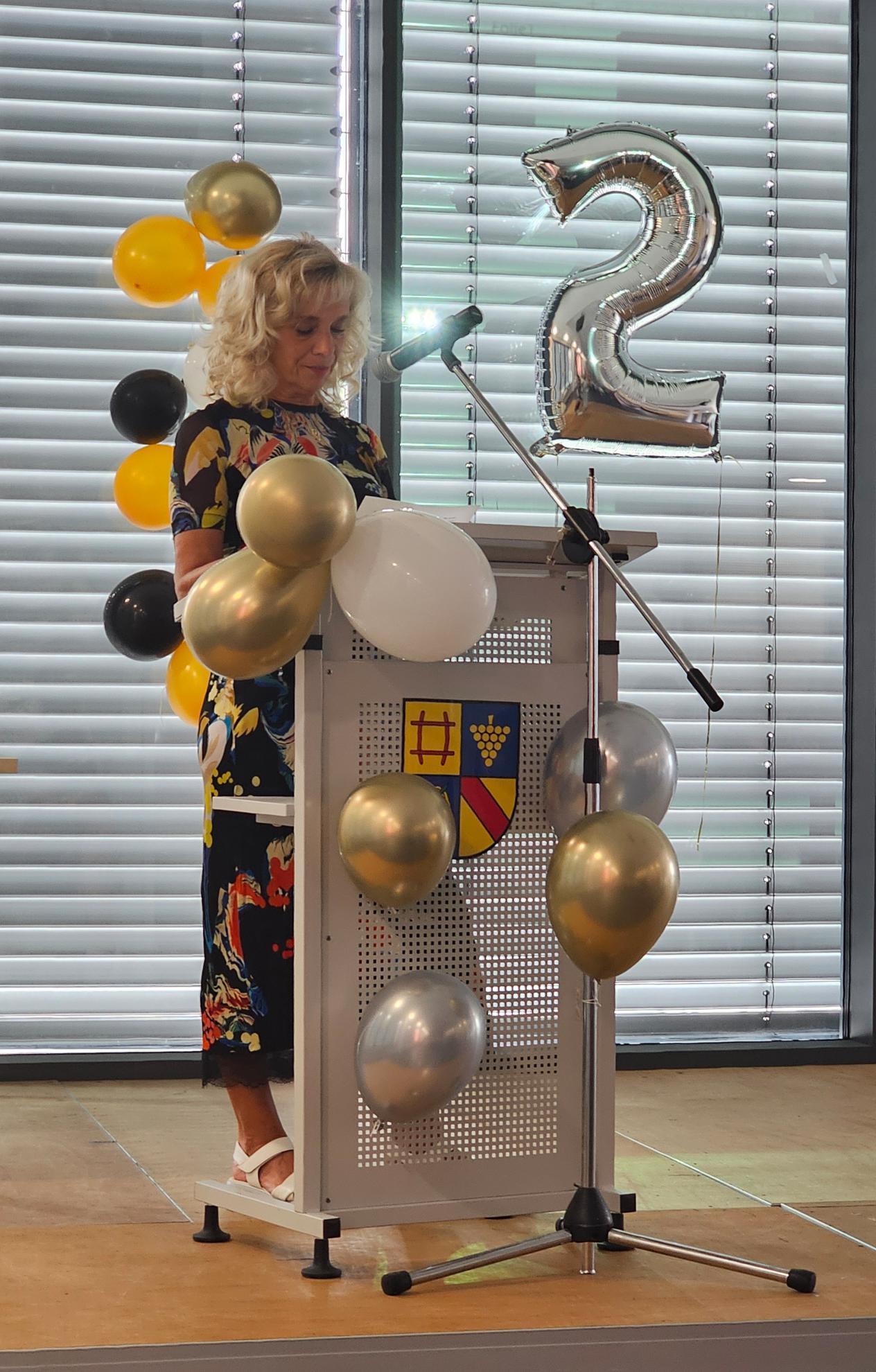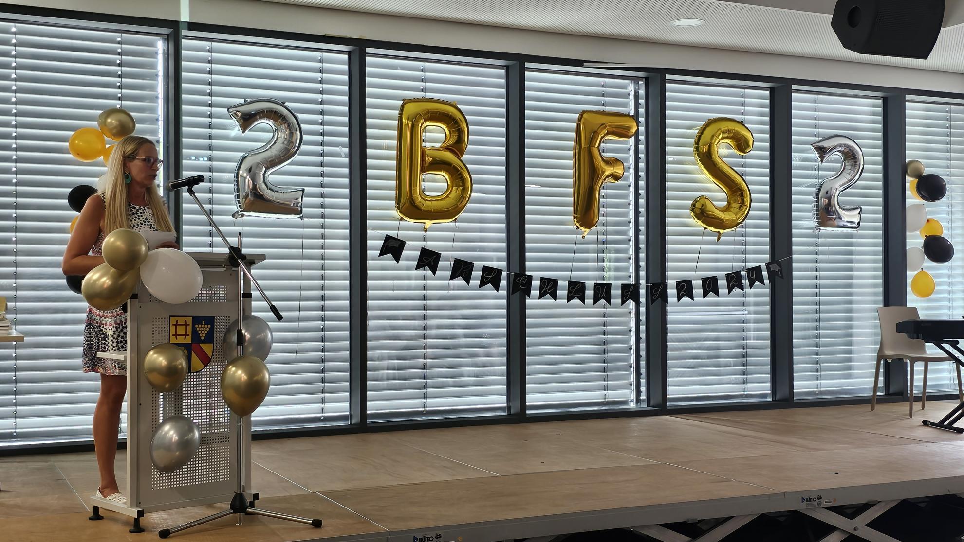 Schulleiterin Gabriele Reeb verwies in ihren Begrüßungsworten auf das Motto der Einladung zur Abschlussfeier der 2BFS: „Wir sind am Ziel und unsere Lehrer sind am Ende.“, welches sicherlich gut zu der intensiven Zeit passe, die die Absolvent:innen die letzten Wochen und Monate erlebt hätten. Mit guten Wünschen für die Zukunft verabschiedete sich Frau Reeb und bedankte sich noch bei Herrn Kühlmann und Frau Merkel für die Organisation der Prüfungen.